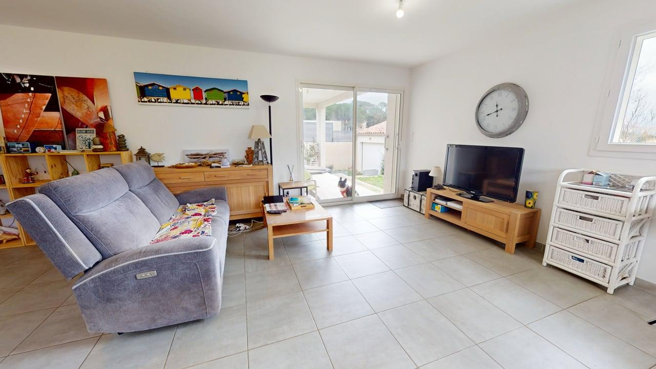 Le séjour, équipé d'une climatisation réversible, s'ouvre directement sur une terrasse couverte, apportant une belle continuité entre intérieur et extérieur.