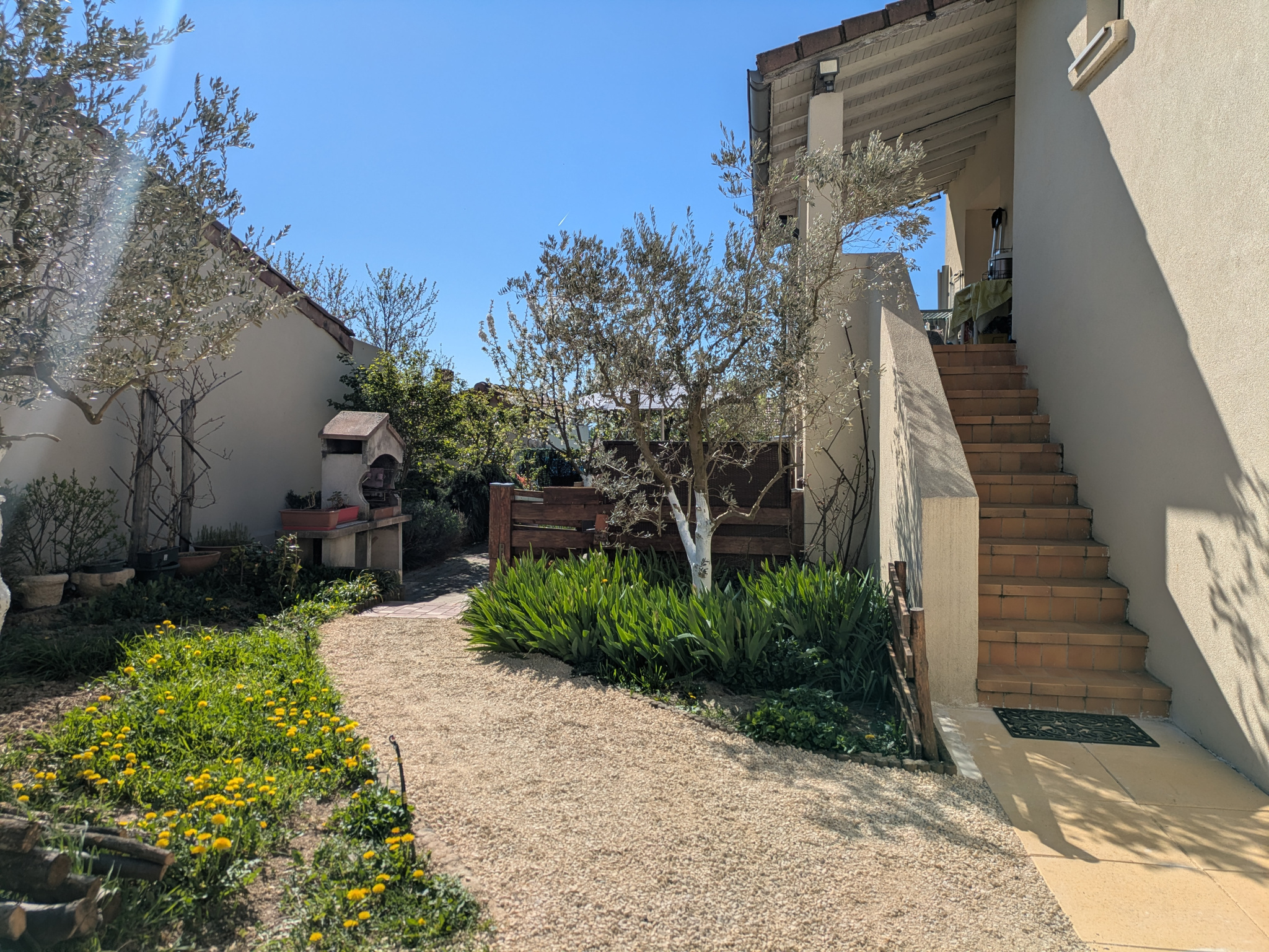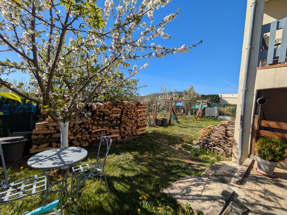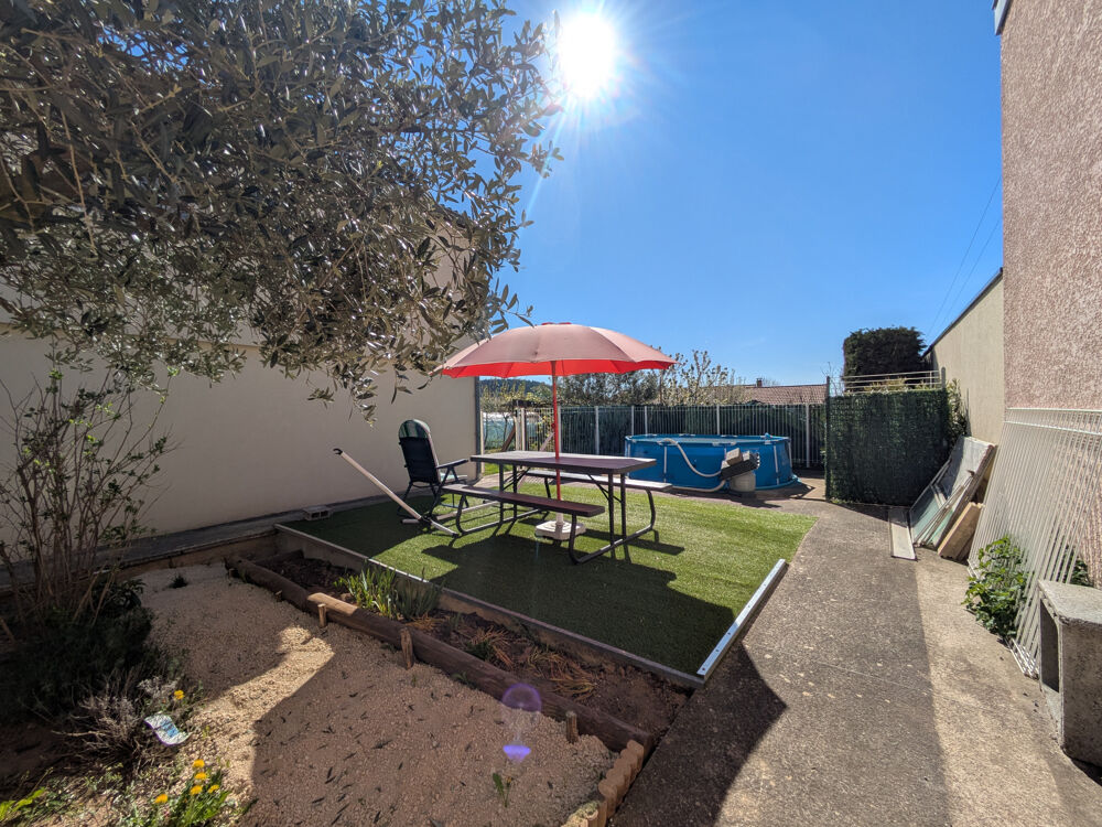 Le terrain d'environ 900m2 est entièrement clos et arboré. Un espace terrasse et coin pour piscine hors-sol sont situés à l'abris des regards. Eau de pluie récupérée pour l'arrosage du jardin.