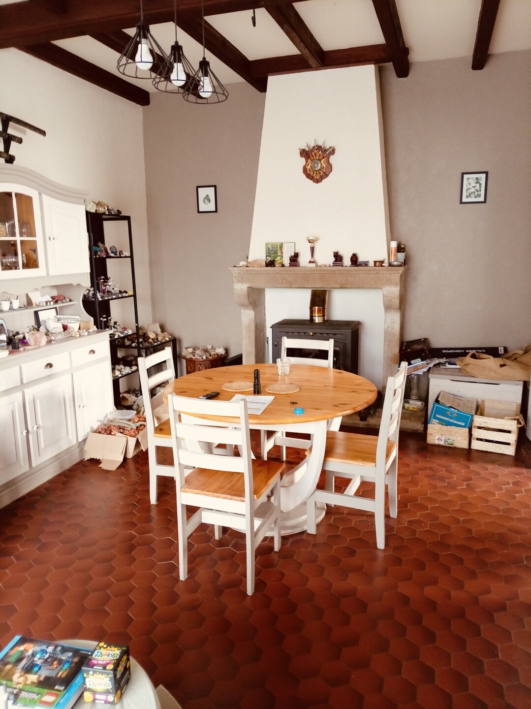 Le premier étage comprend une cuisine, trois chambres, un salon lumineux avec insert ainsi qu'une salle de bains.