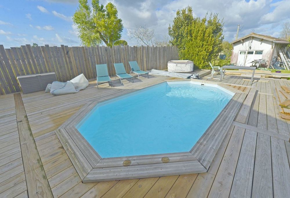 En prolongement de la maison, il y a une terrasse d'environ 100 m² avec une piscine chauffé de 5,5 M par 3,5 M.