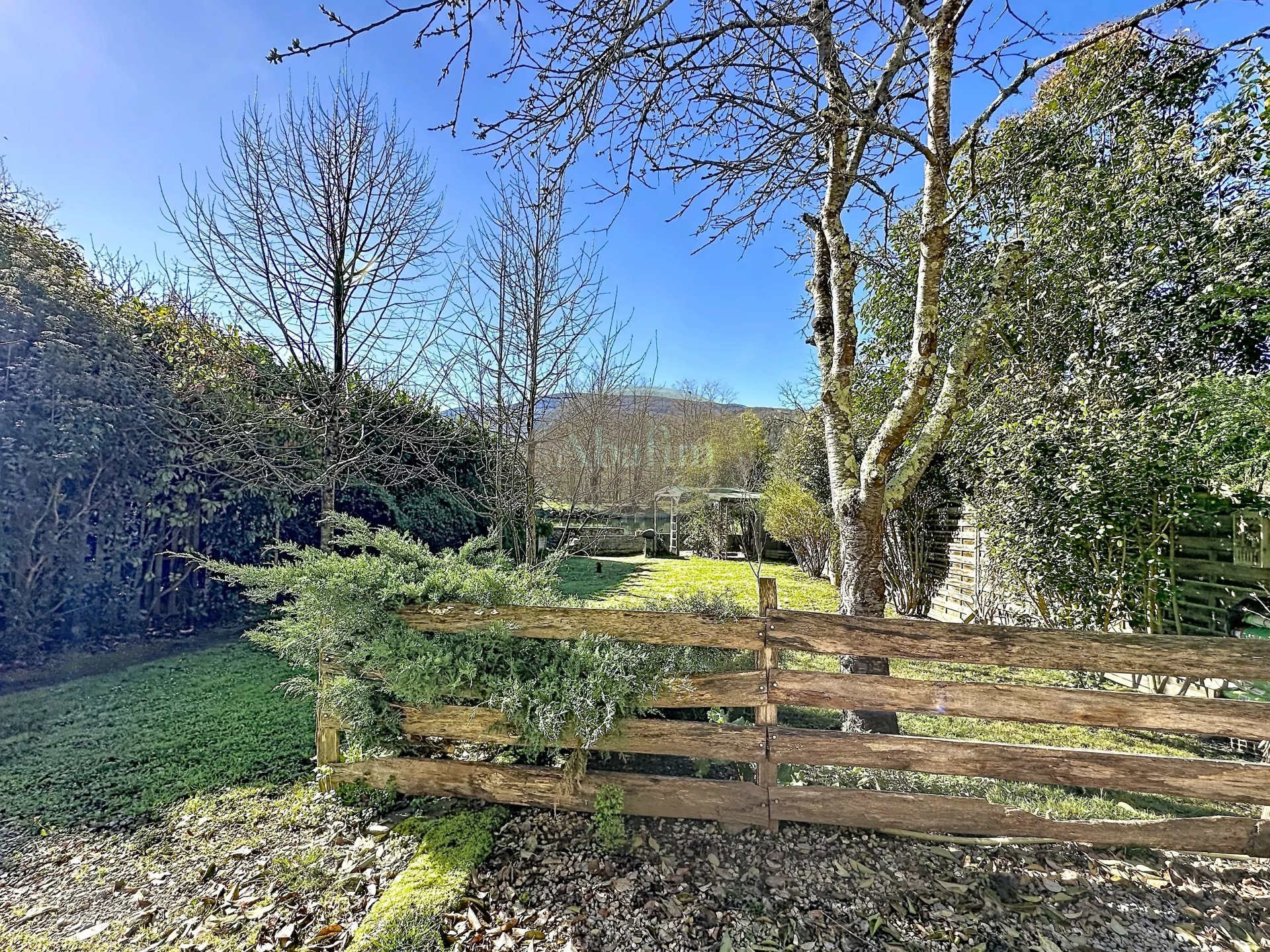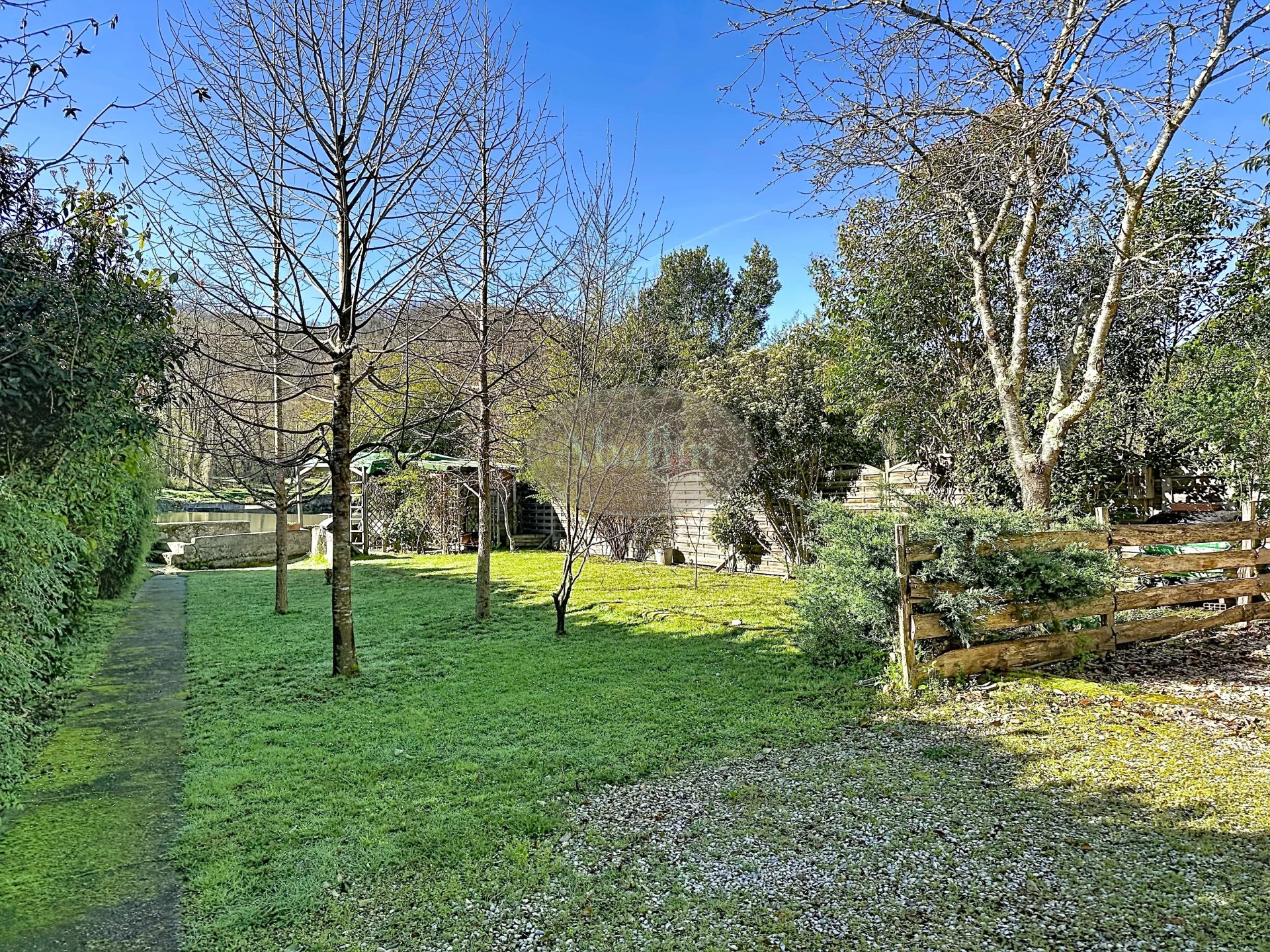 Au fond du jardin joliment parsemé d'arbres fruitiers et d'ornements, le murmure de l'eau vous guidera vers une pergolas tout au bord de la rivière.