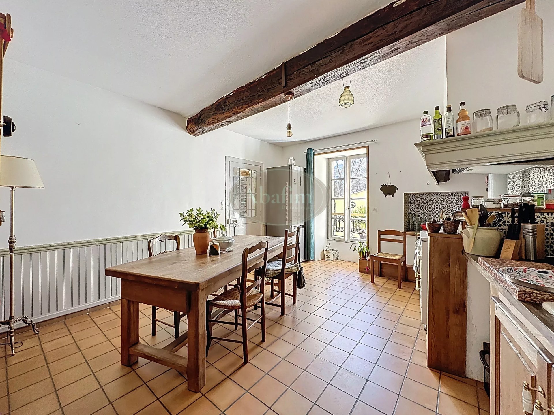 La grande porte d'entrée vous donne accès à un vaste hall orné de son escalier central menant aux étages; il dessert à l´est la cuisine (19 m²) très chaleureuse dotée de carreaux en terre cuites; à l´Est, une lumineuse pièce de vie (24,5 m²) et son parquet en bois.