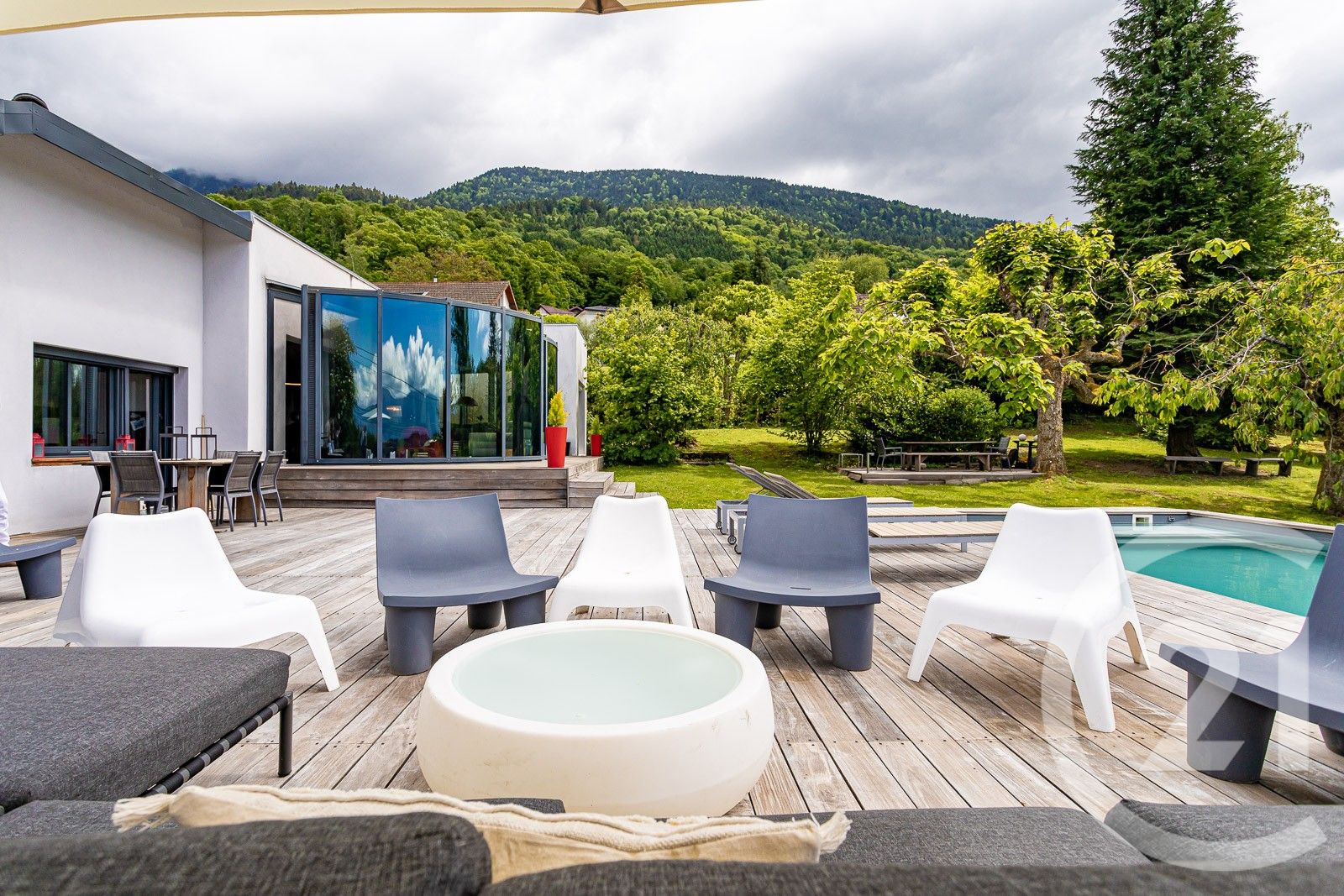 La grande terrasse en IPE de plus de 100 m2 prolonge naturellement le séjour et mène à la piscine de 9 x 4 m, véritable pièce de vie extérieure dès les beaux jours.
