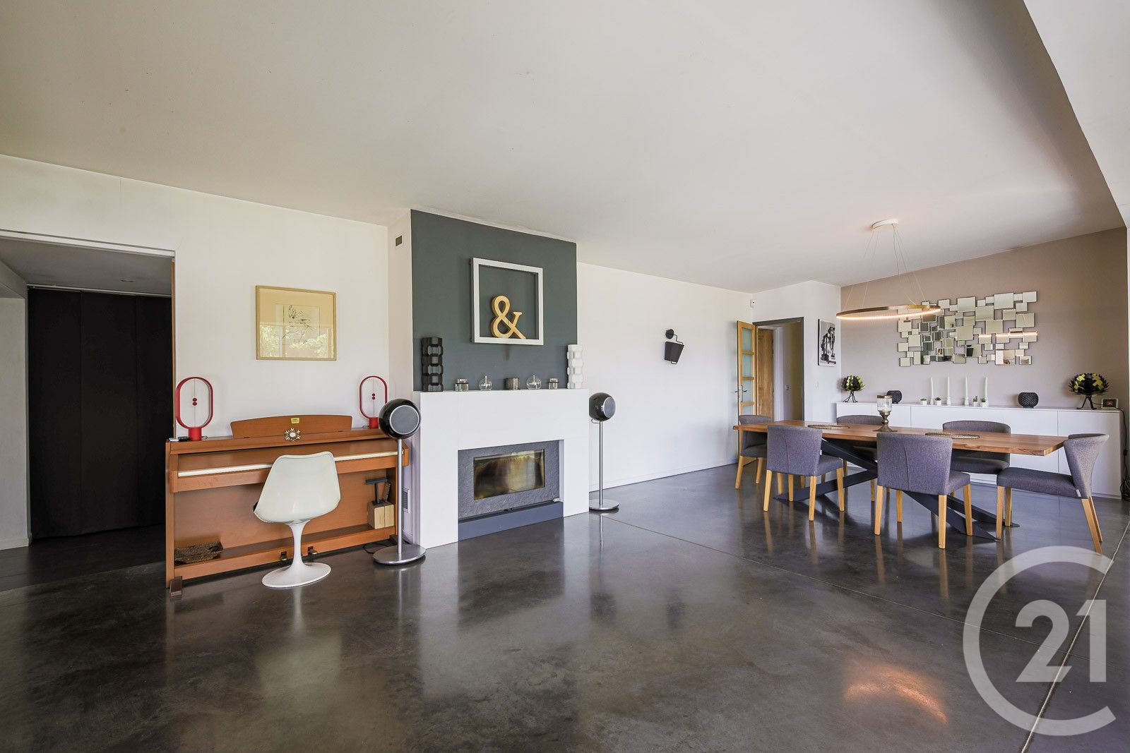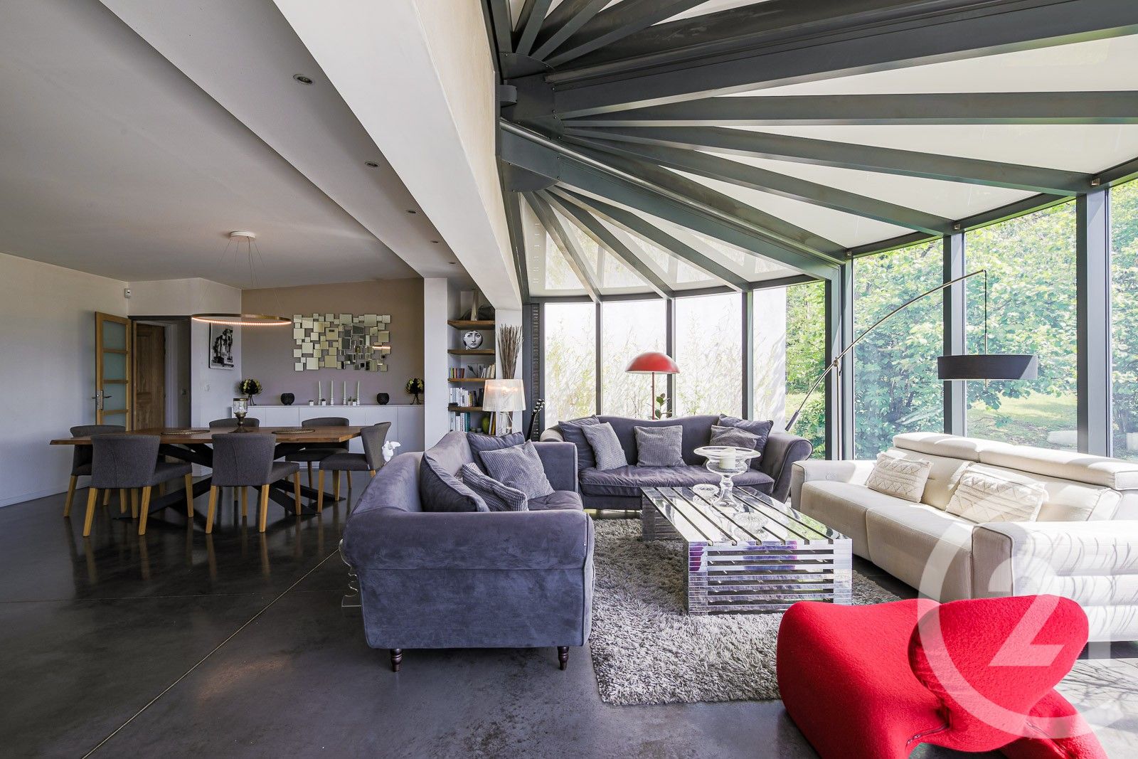 Un salon-rotonde de 66 m2, baigné de lumière, offrant une vue à 180° et s'ouvrant à 120° sur un jardin entièrement clos et arboré de plus de 1 900 m2, sans aucun vis-à-vis.