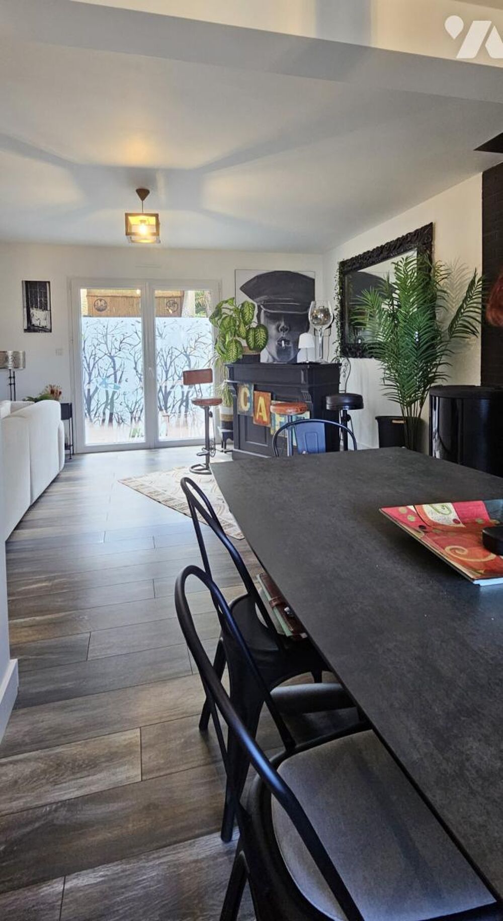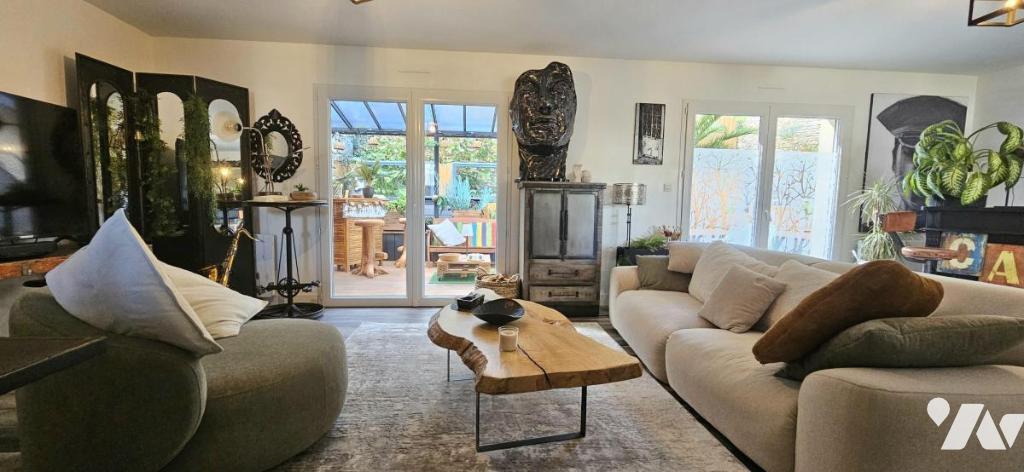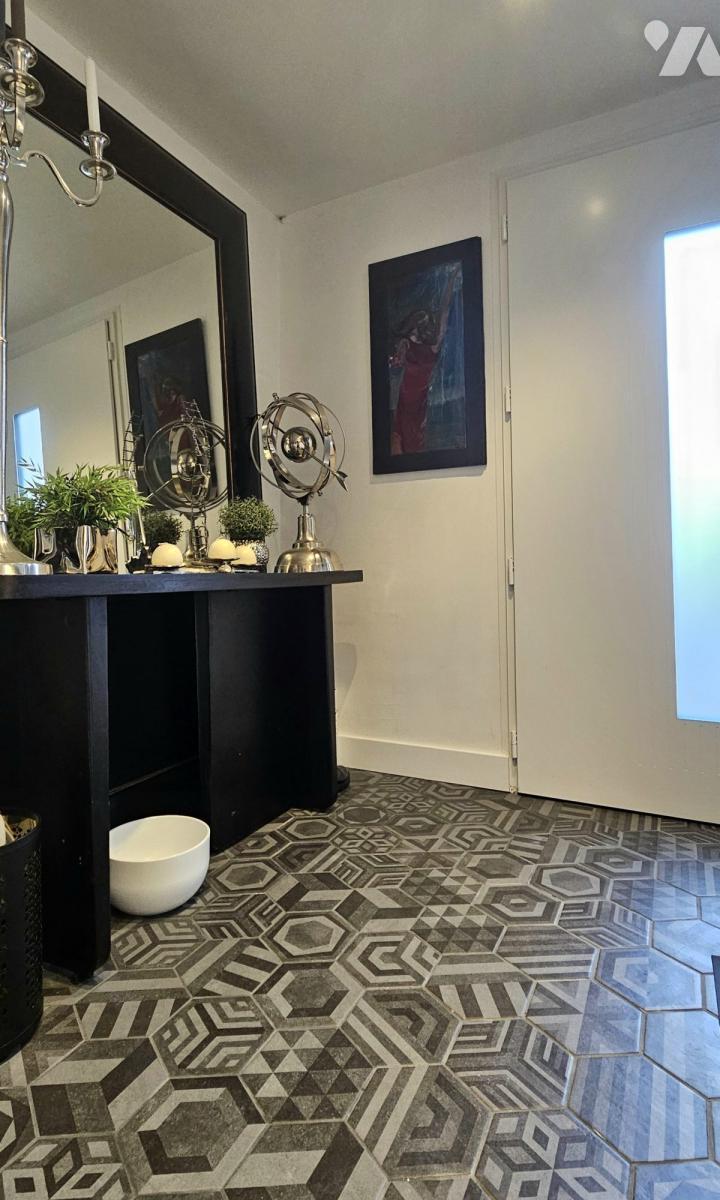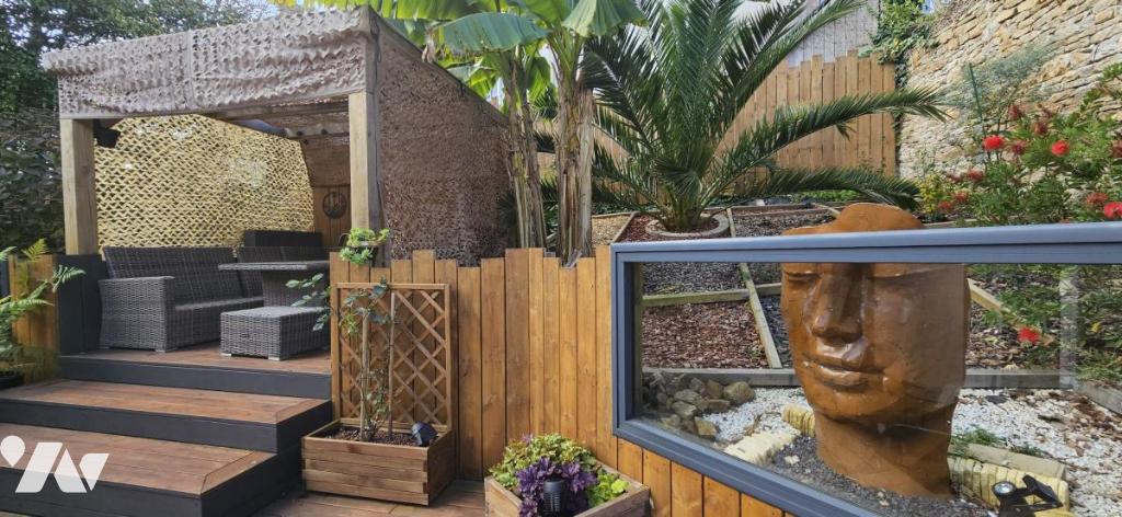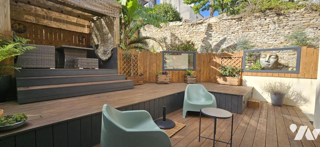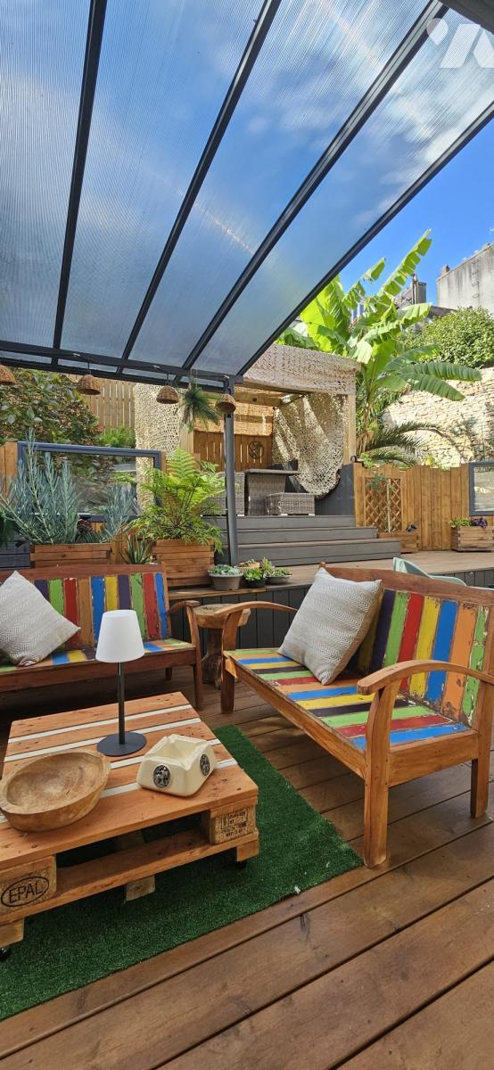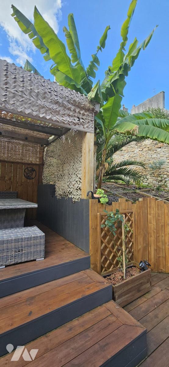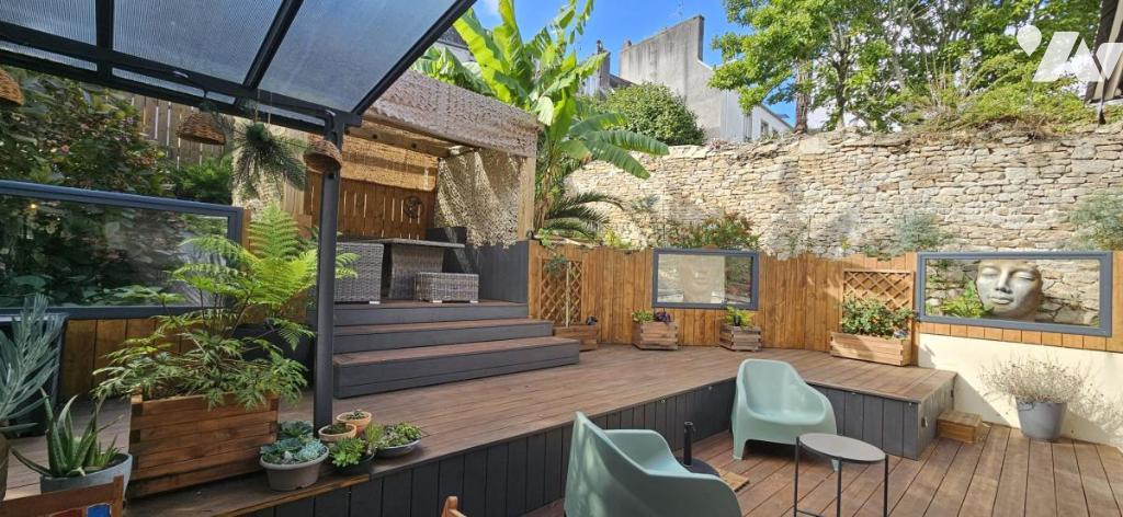 À l'arrière, un jardin intime s'organise autour d'une terrasse d'environ 57 m², avec différents espaces de détente. Un véritable espace de vie supplémentaire en extérieur, idéal pour profiter du soleil, recevoir ou encore installer un jacuzzi.