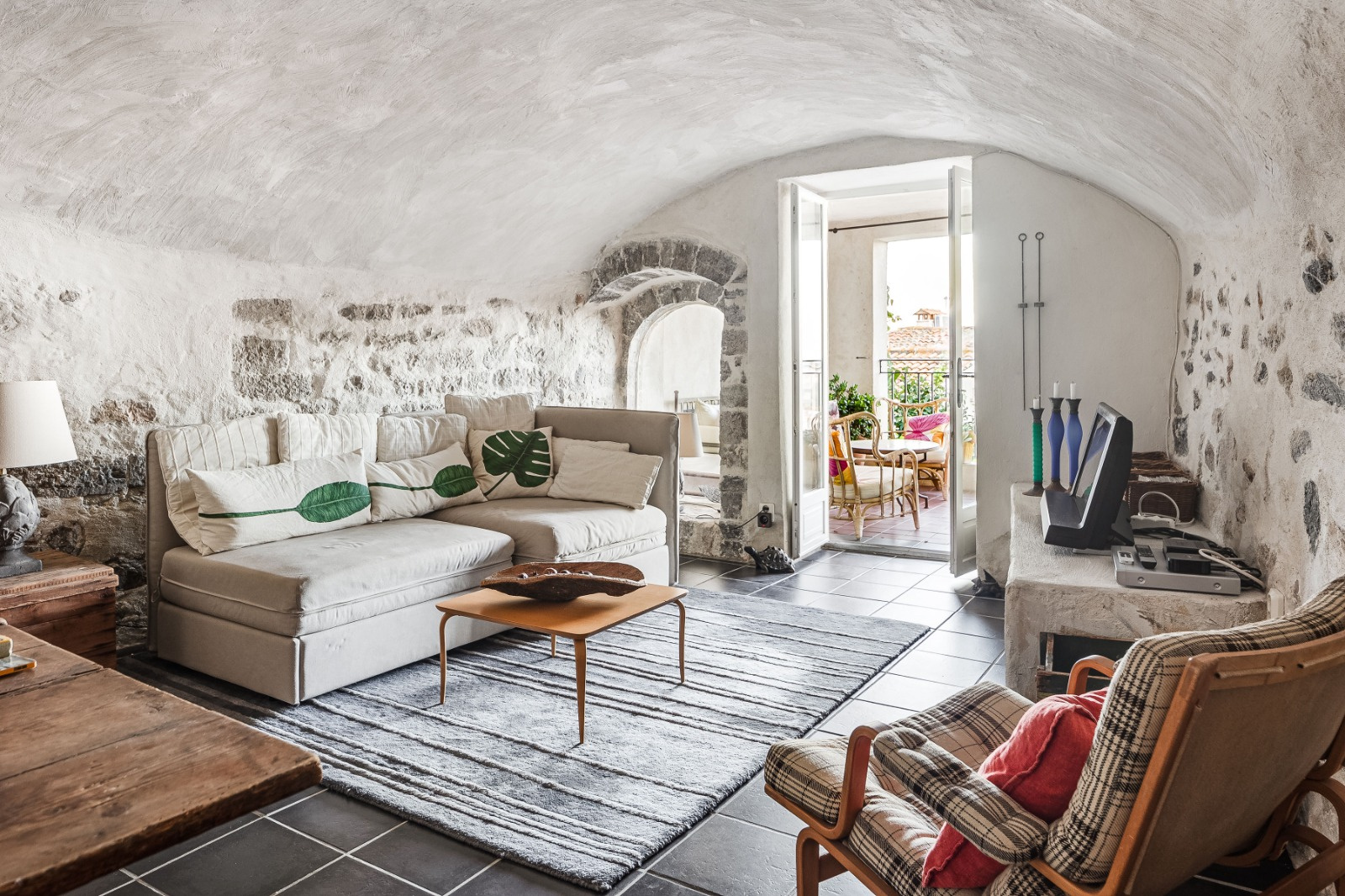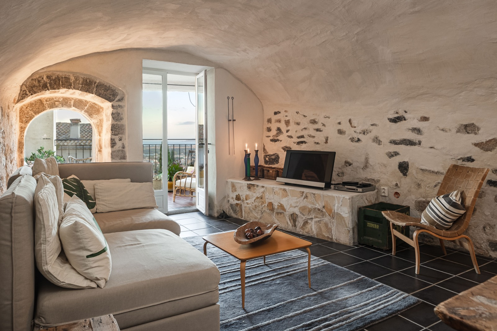 En rez-de-chaussée vous trouverez un salon vouté de 25m2 donnant sur la belle terrasse et une suite de plain peid. A L'étage la cuisine équipée, la salle à manger donnent sur la superbe terrasse vue mer ; sur ce même niveau deux chambres avec salle de bain.