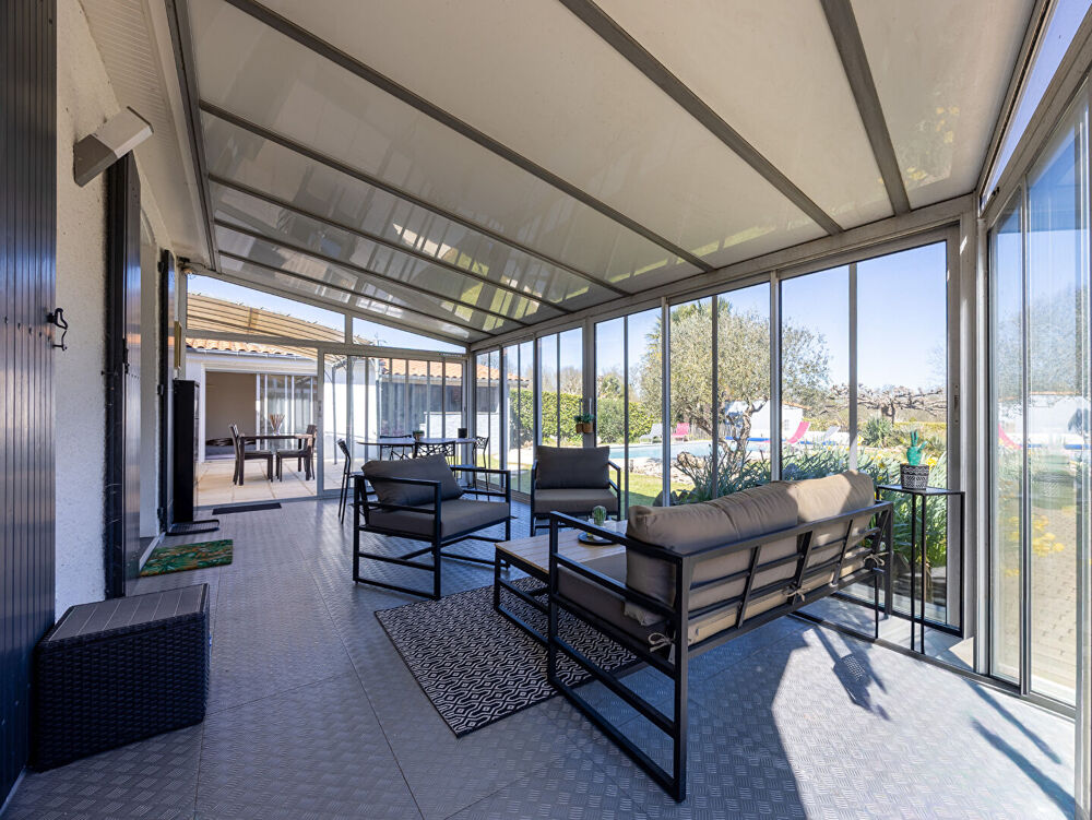 Découvrez cette magnifique maison de plain-pied située dans un environnement calme et agréable. Elle s'ouvre sur une entrée menant à un spacieux salon-séjour lumineux avec une cuisine moderne, aménagée et entièrement équipée. Dans le prolongement, une belle véranda offre une vue agréable sur la piscine et sa cuisine d'été, idéale pour profiter des beaux jours. Côté nuit, la maison dispose de 4 chambres ainsi que d'une salle d'eau. Une buanderie et un grand garage viennent compléter l'ensemble. Très bien entretenue, cette maison offre un cadre de vie confortable et convivial. A visiter sans tarder ! Visite virtuelle disponible sur RDV téléphonique. Contactez-nous dès maintenant pour organiser une visite. Estimation Offerte : Profitez de notre service d'estimation pour connaître la valeur de votre bien sur le marché actuel. (4.49 % honoraires TTC à la charge de l'acquéreur.)Etat général : Bon Etat