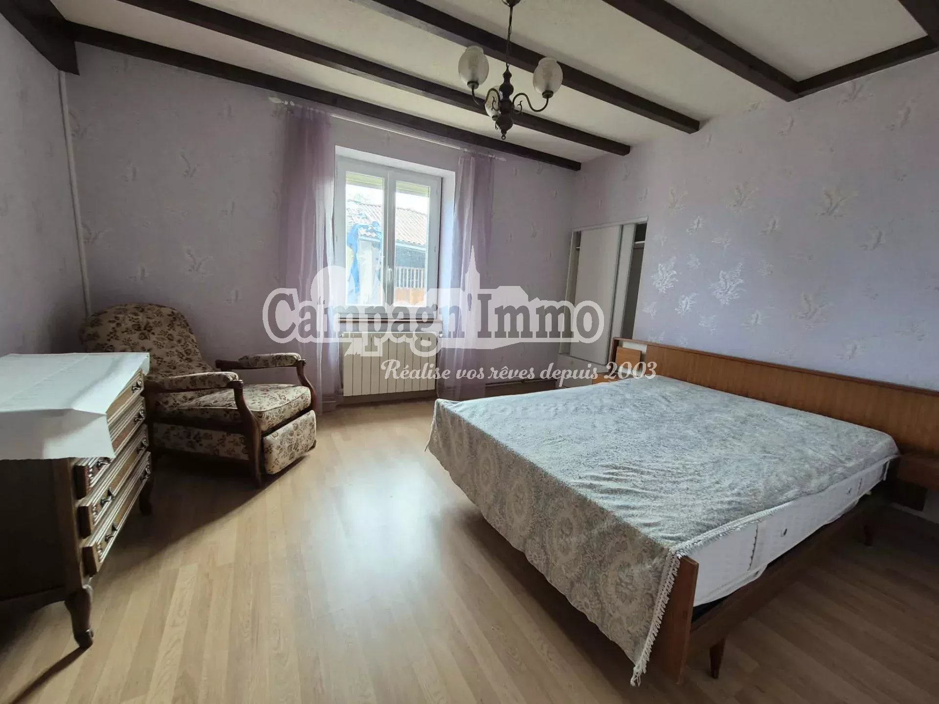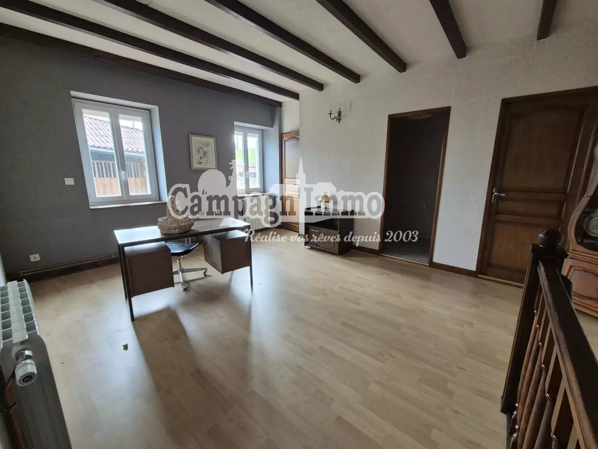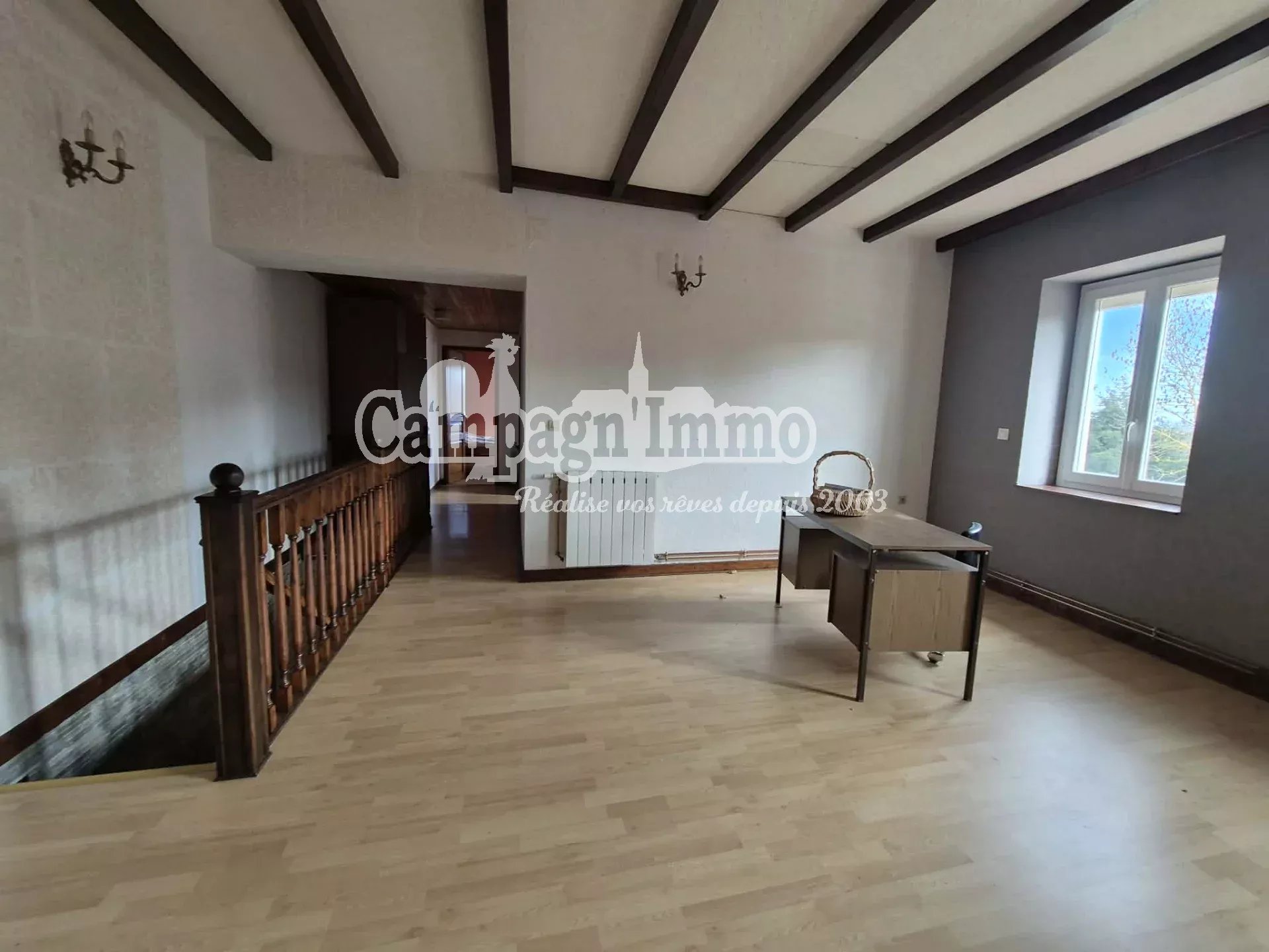 D'une surface d'environ 130 m² sur deux niveaux, il comprend une cuisine, un séjour avec cheminée insert, une salle d'eau, deux grandes chambres et un vaste espace à l'étage offrant des possibilités d'aménagement.
