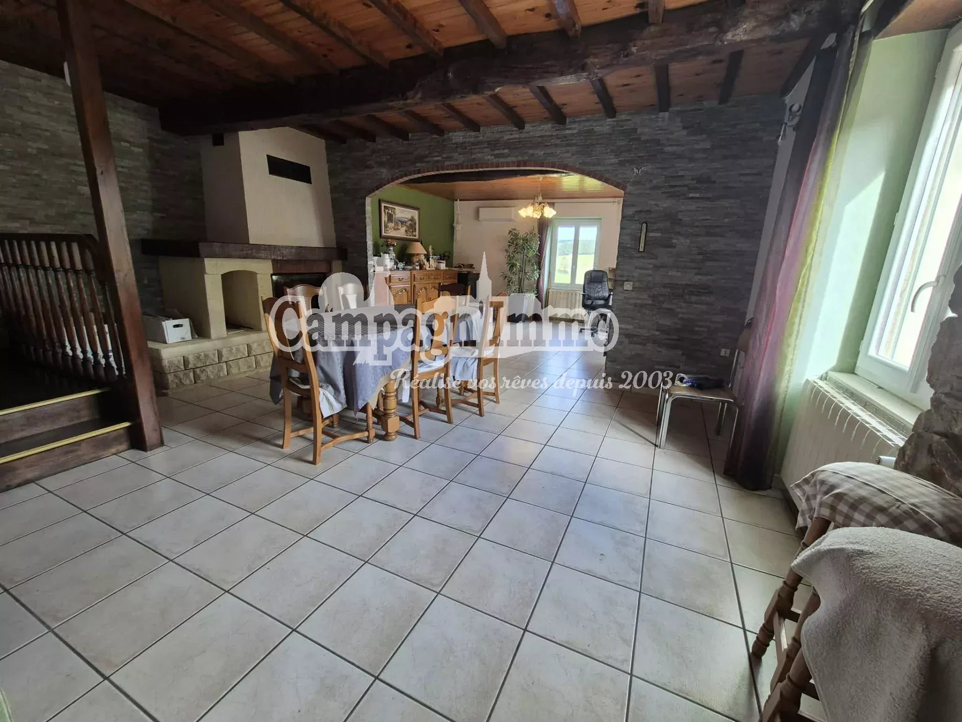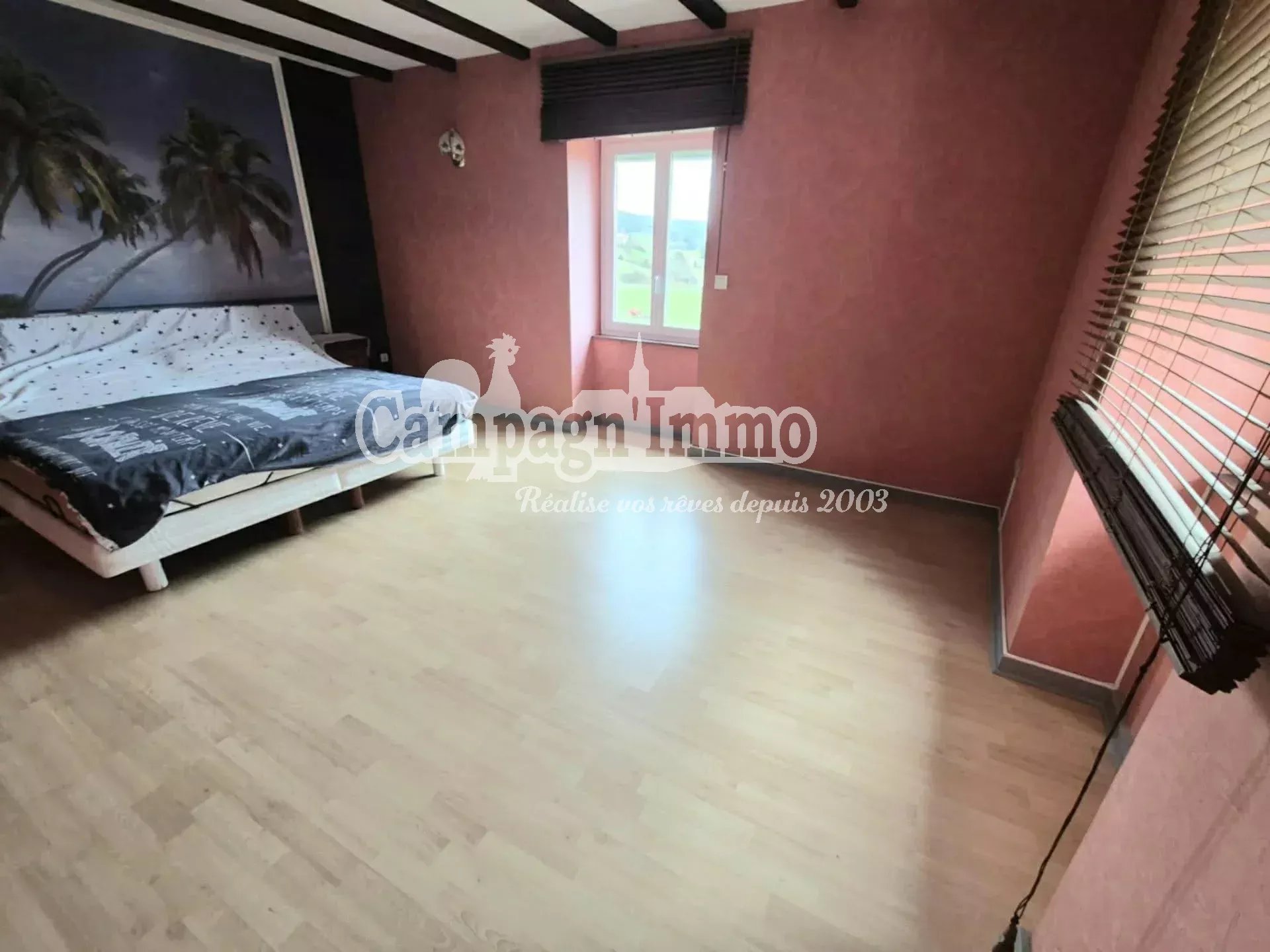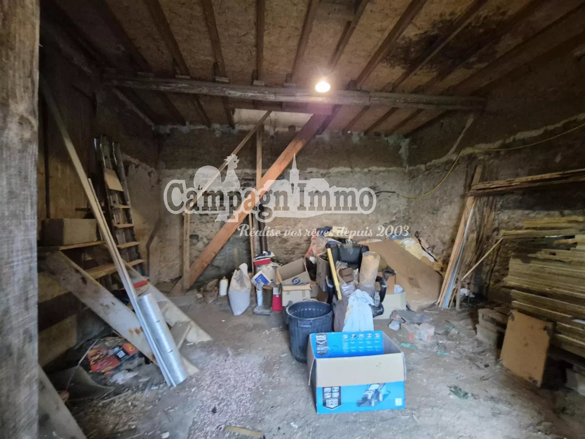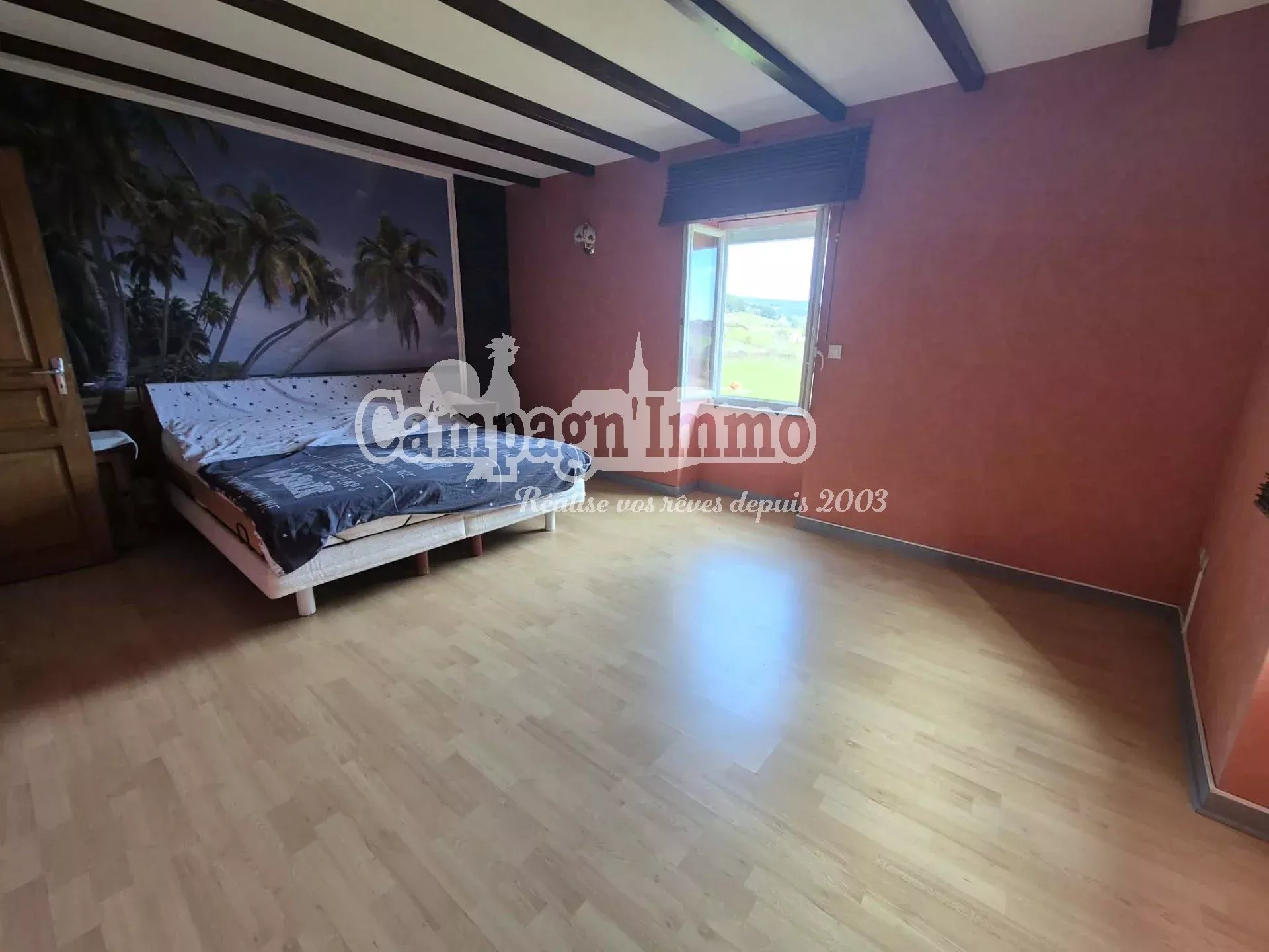 D'une surface d'environ 130 m² sur deux niveaux, il comprend une cuisine, un séjour avec cheminée insert, une salle d'eau, deux grandes chambres et un vaste espace à l'étage offrant des possibilités d'aménagement.