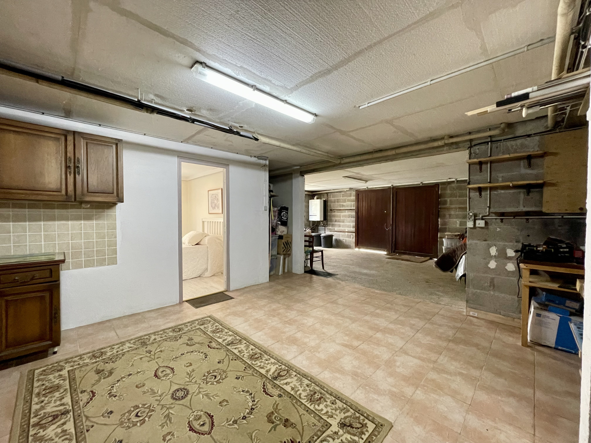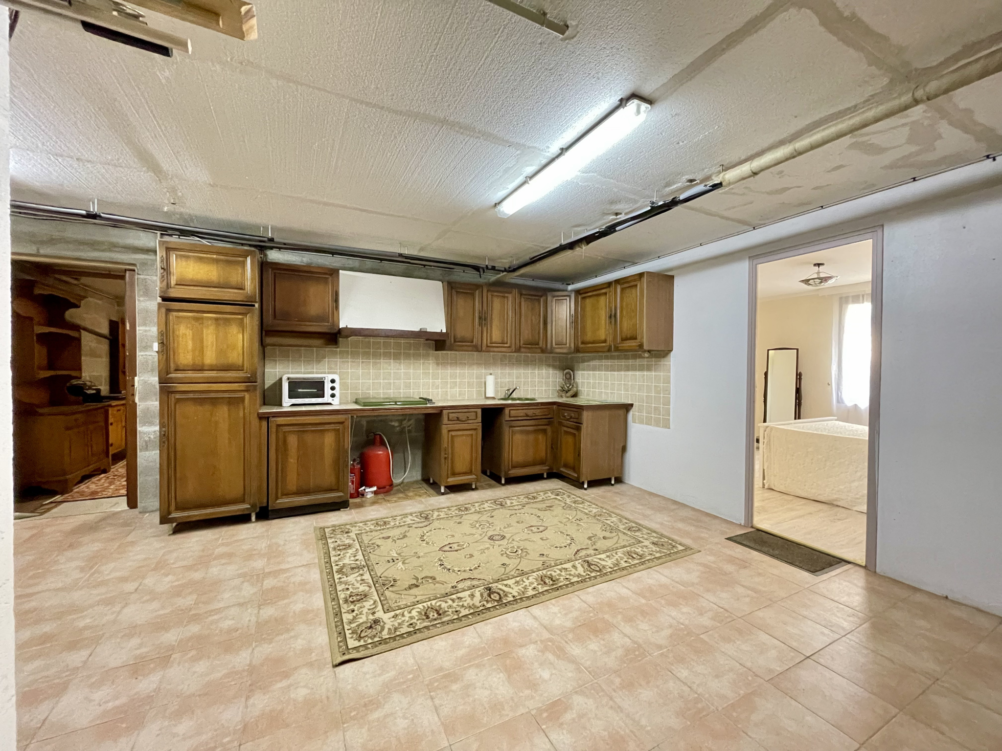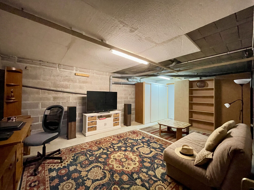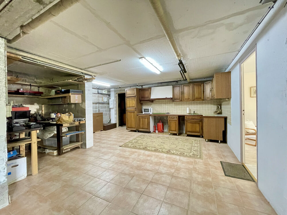 sous sol : cuisine d'été, équipée 1 chambre avec salle d'eau/wc (sanibroyeur), 1 pièce de 26 m2, garage de 40 m2, buanderie de 4 m2.