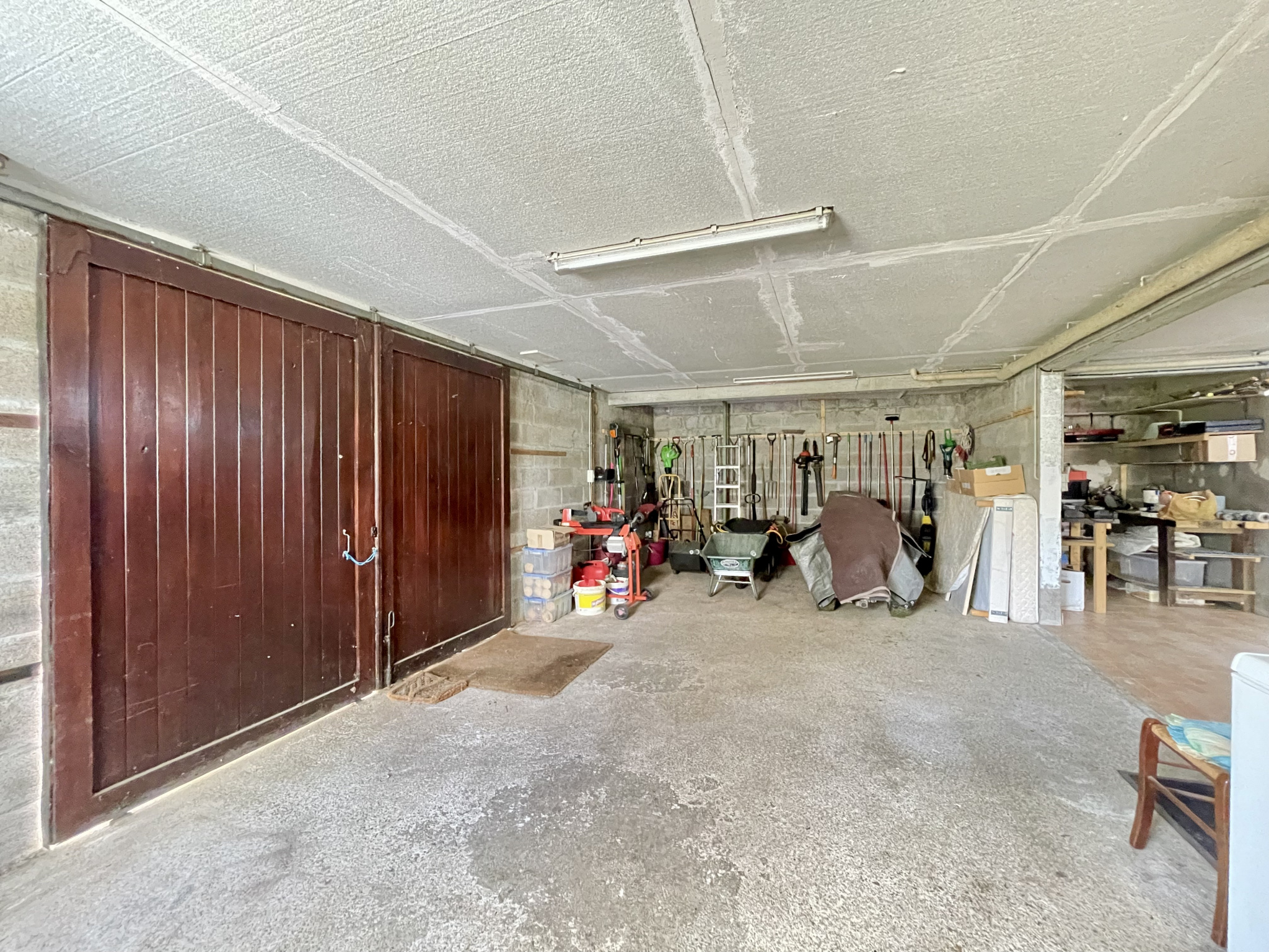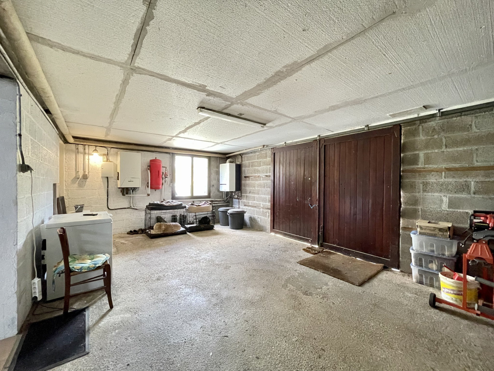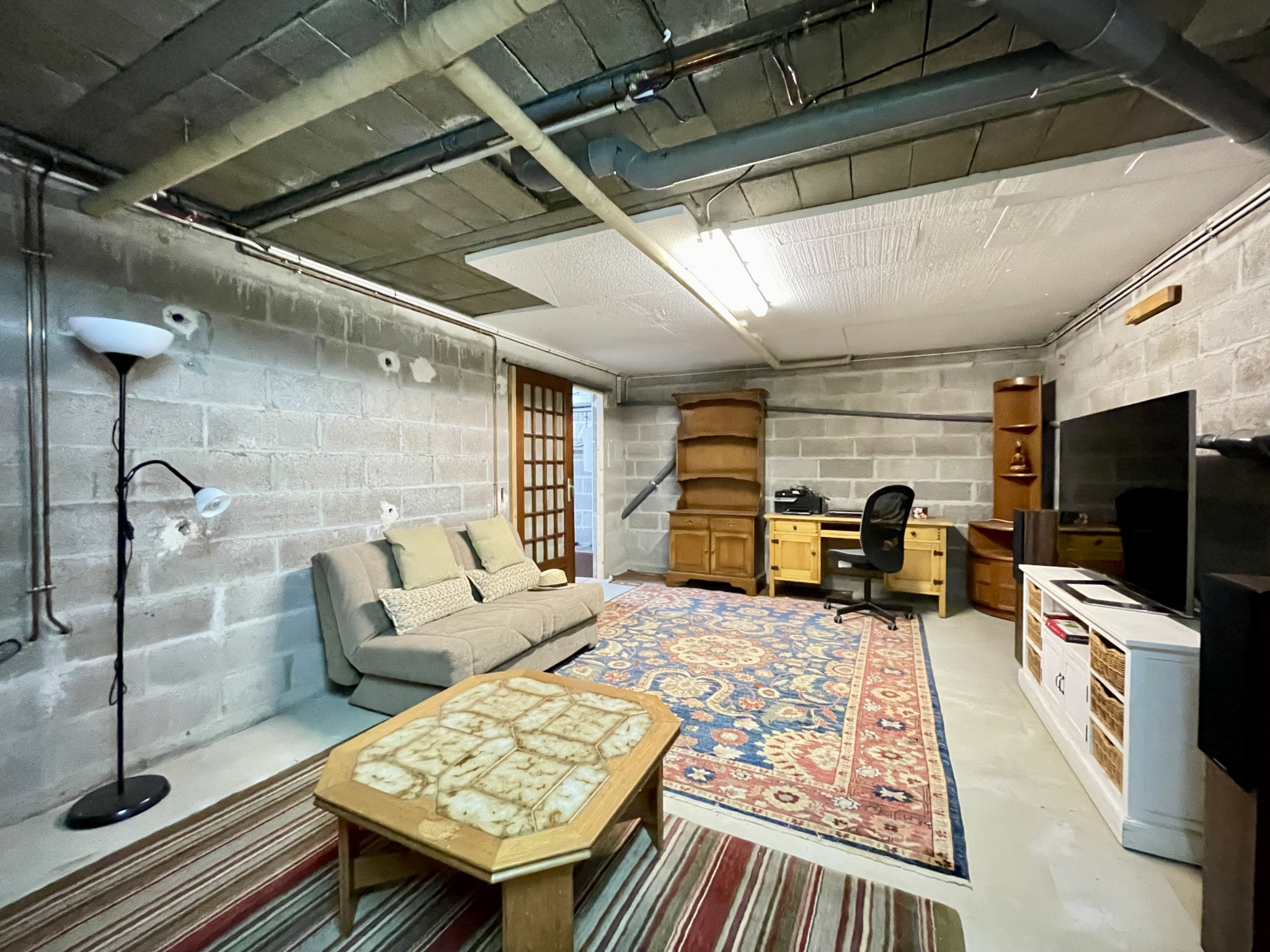 sous sol : cuisine d'été, équipée 1 chambre avec salle d'eau/wc (sanibroyeur), 1 pièce de 26 m2, garage de 40 m2, buanderie de 4 m2.