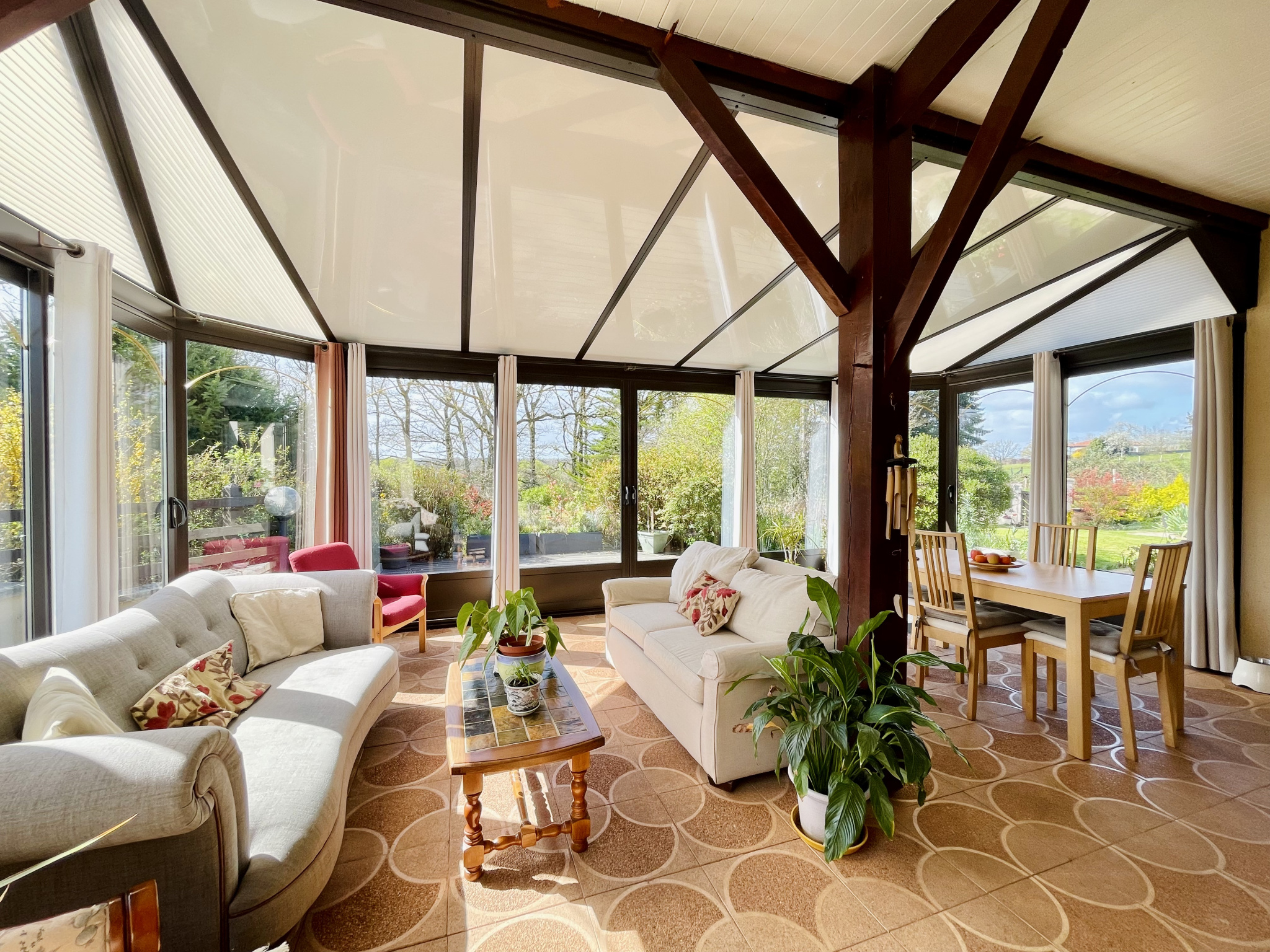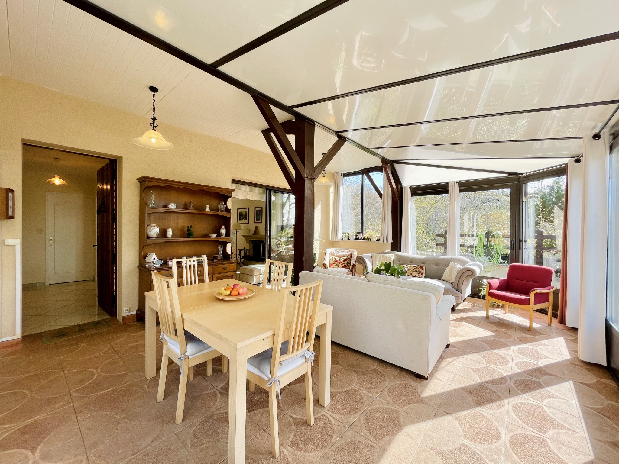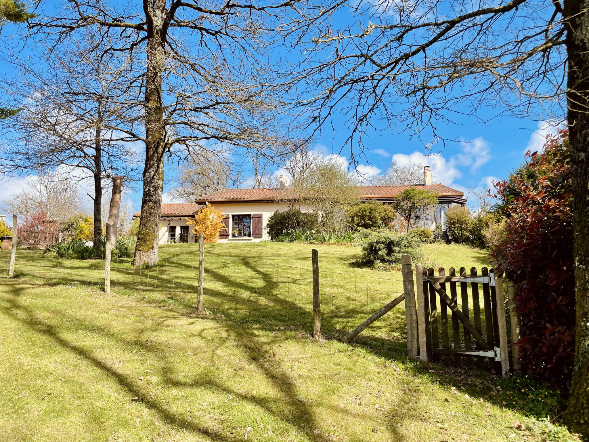 REF : 34935 : 280 900 euros HAI, 11 kms de Confolens (16), dans un cadre verdoyant, environnement calme, belles prestations pour cette jolie maison de village rénovée de 1982 avec agrandissement en 2007, plain pied avec sous sol semi enterré, 272, 50 m2 env. utilisables dont 145 m2 de surface habitables :au rez de chaussée : spacieuse véranda de 30,50 m2, entrée/couloir, cuisine aménage équipée, salon/séjour (cheminée), salle d'eau avec baignoire/wc, 4 chambres, salle d'eau, cabinet de toilette,