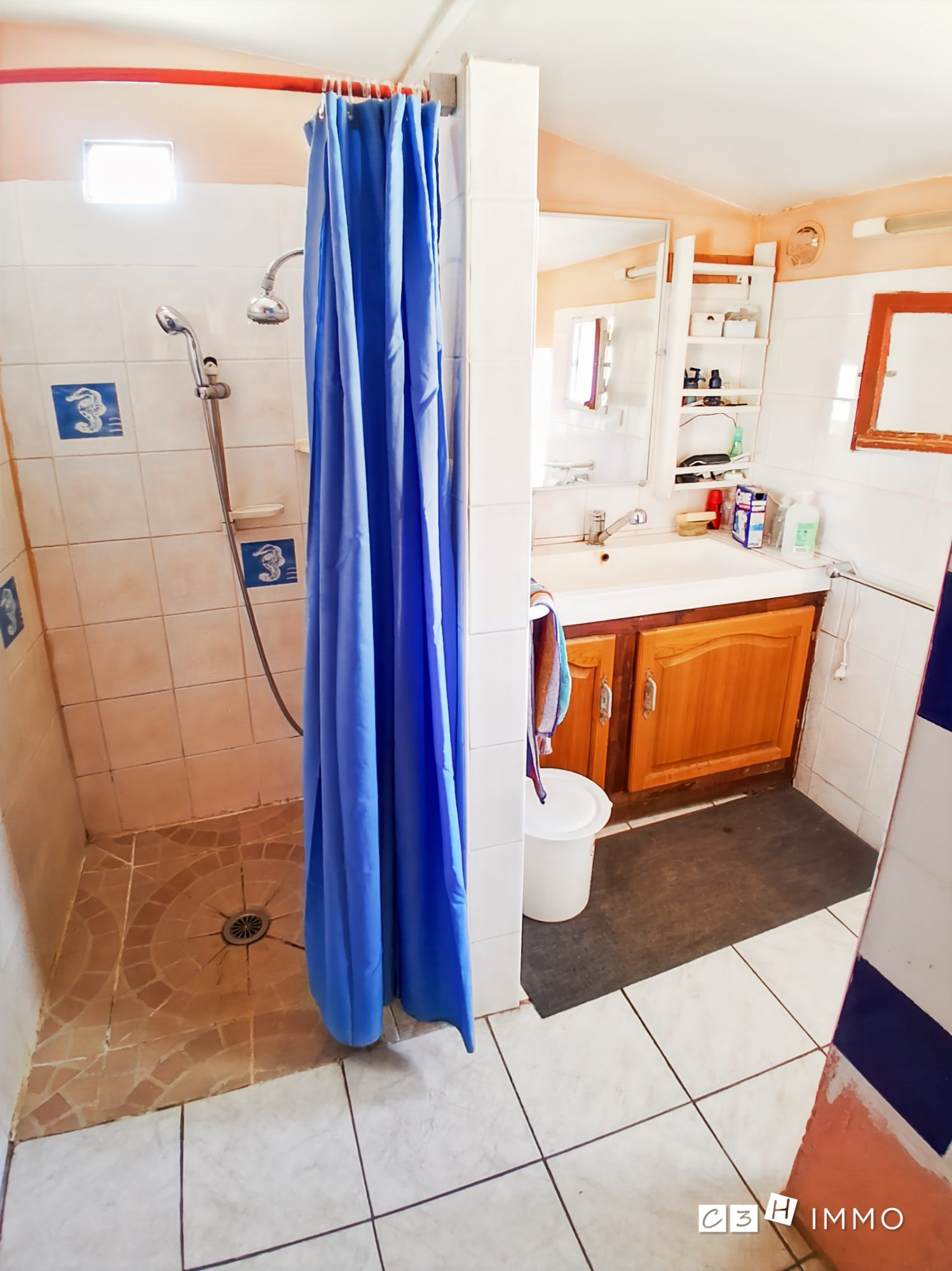 Une salle d'eau avec douche à l'italienne et fenêtre,