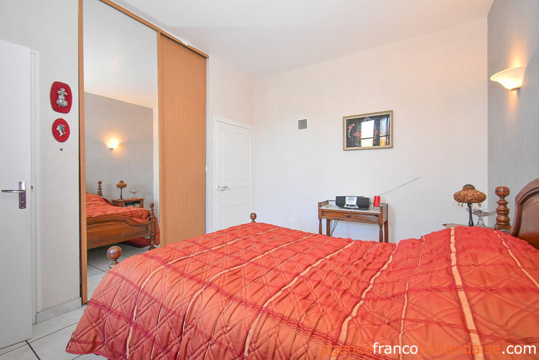 Une seconde porte depuis cette pièce contourne la cuisine et rejoint l'entrée via un dégagement avec placards encastrés et toilette séparée (env.