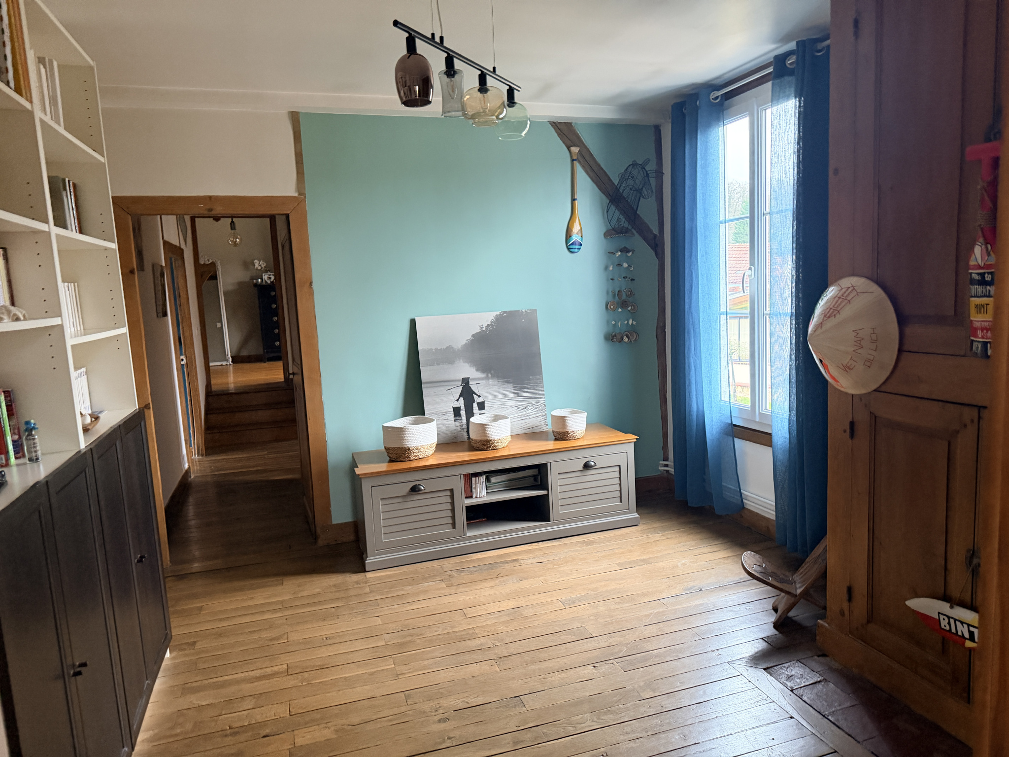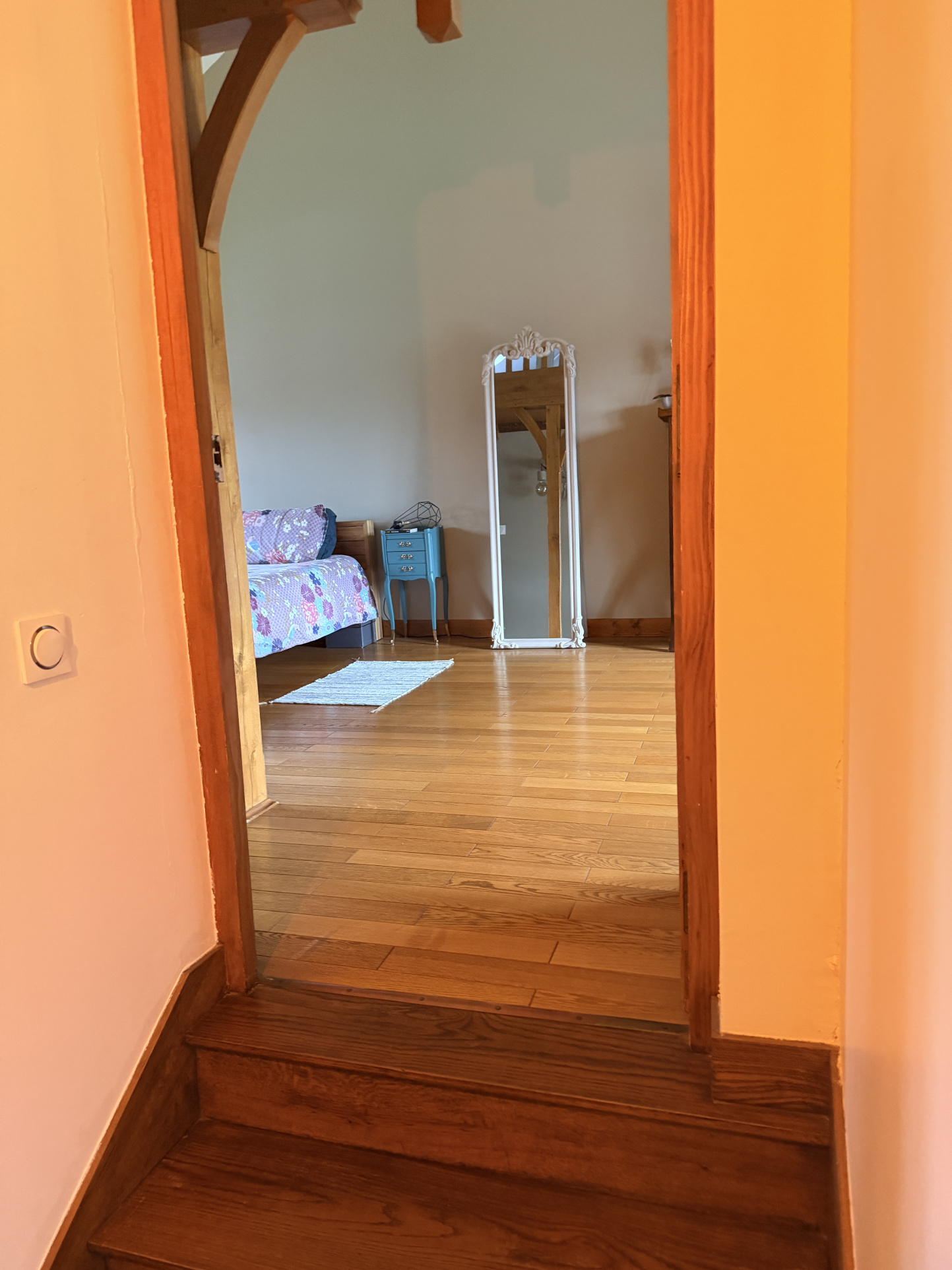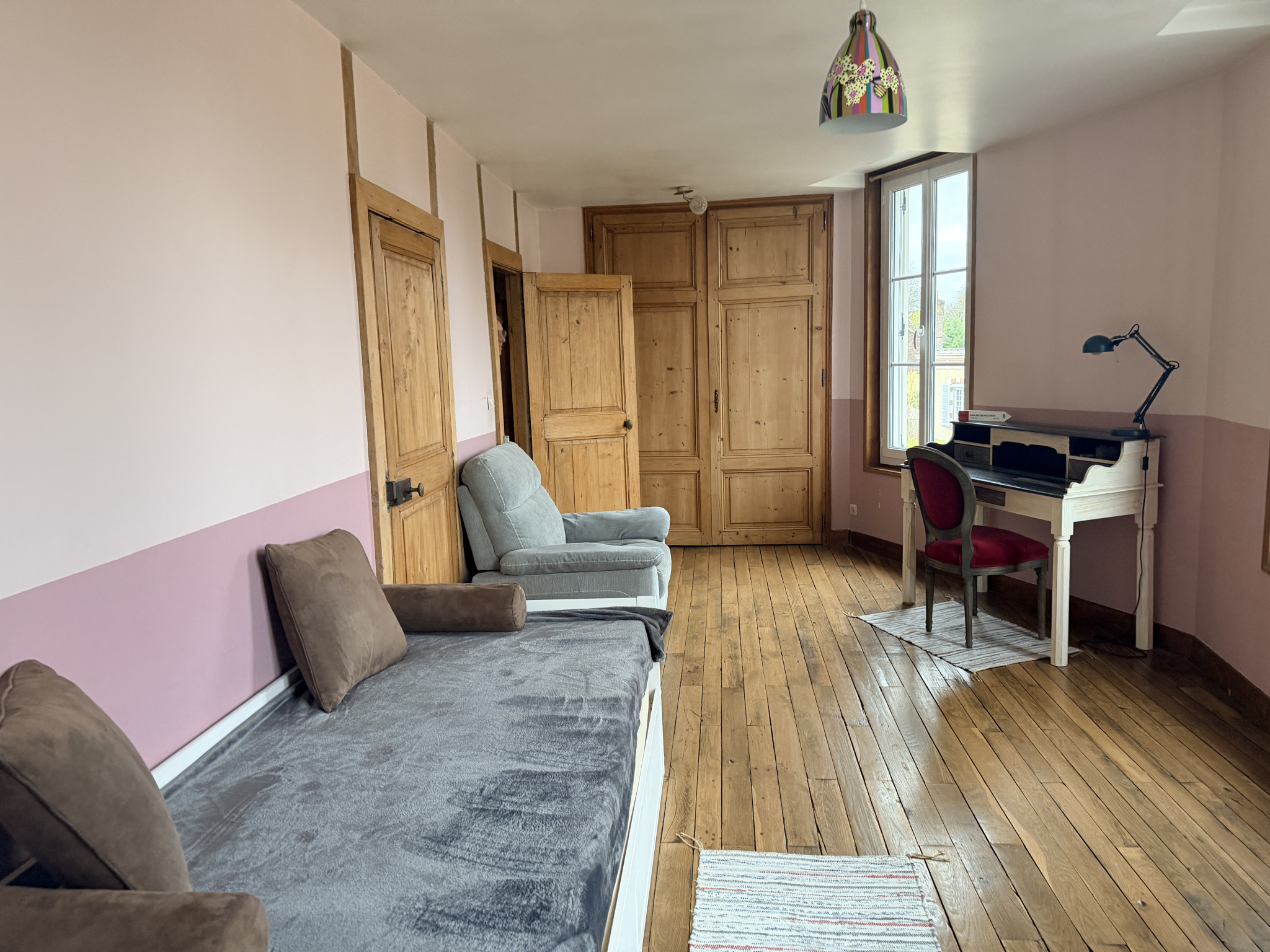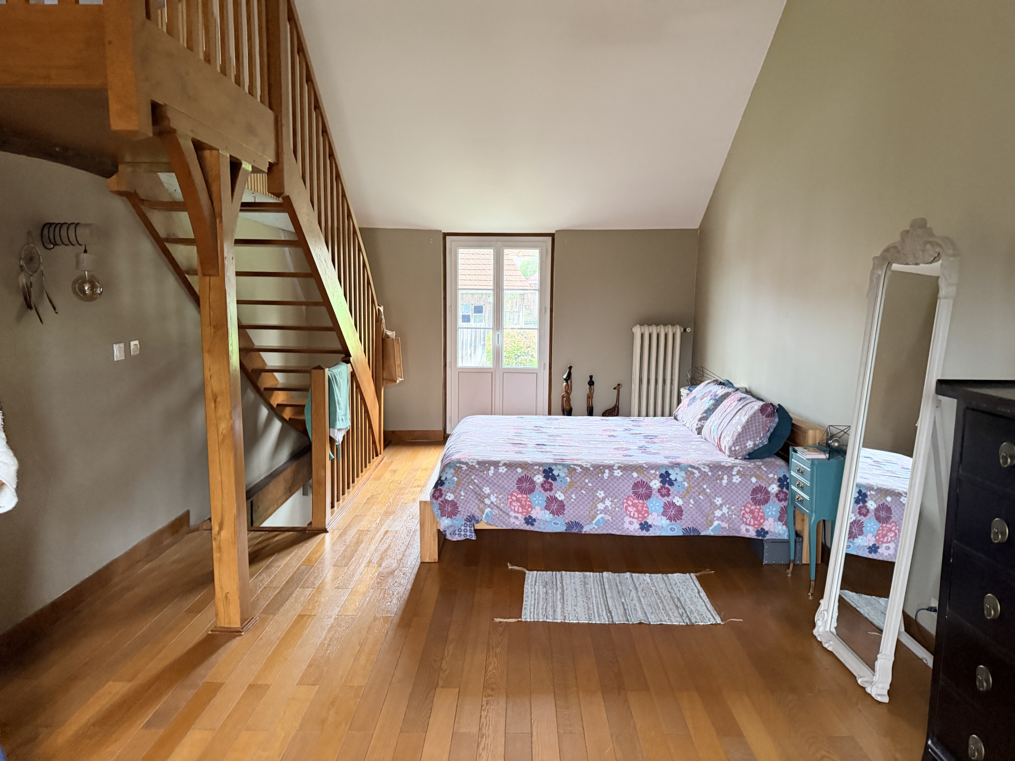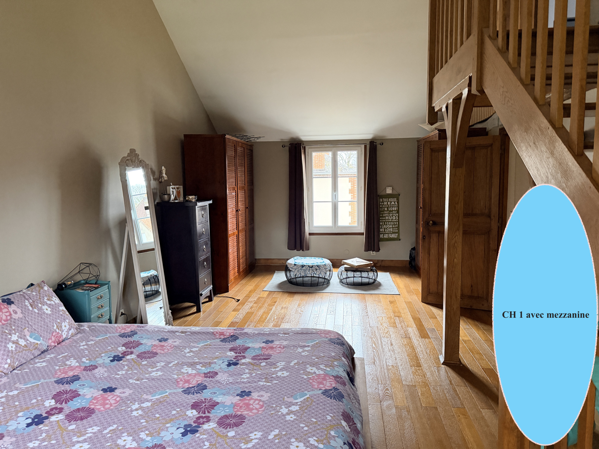 A l'étage: avec deux accès indépendant, un grand palier, salle d'eau, Wc, 4 chambres dont 2 avec salle d'eau privative et une grande chambre avec un espace grenier manssardé (en salle de sport ).