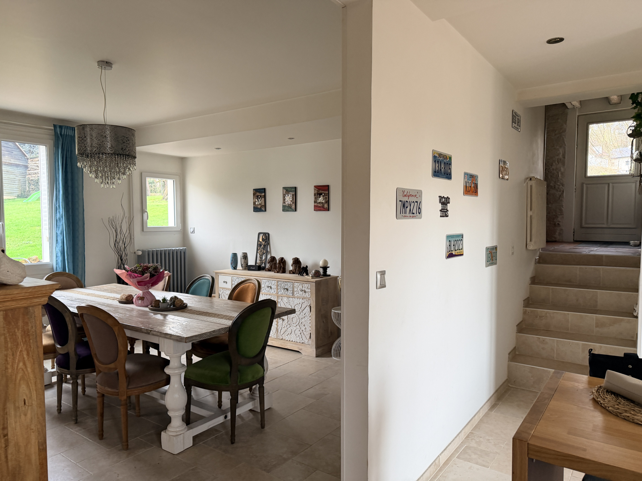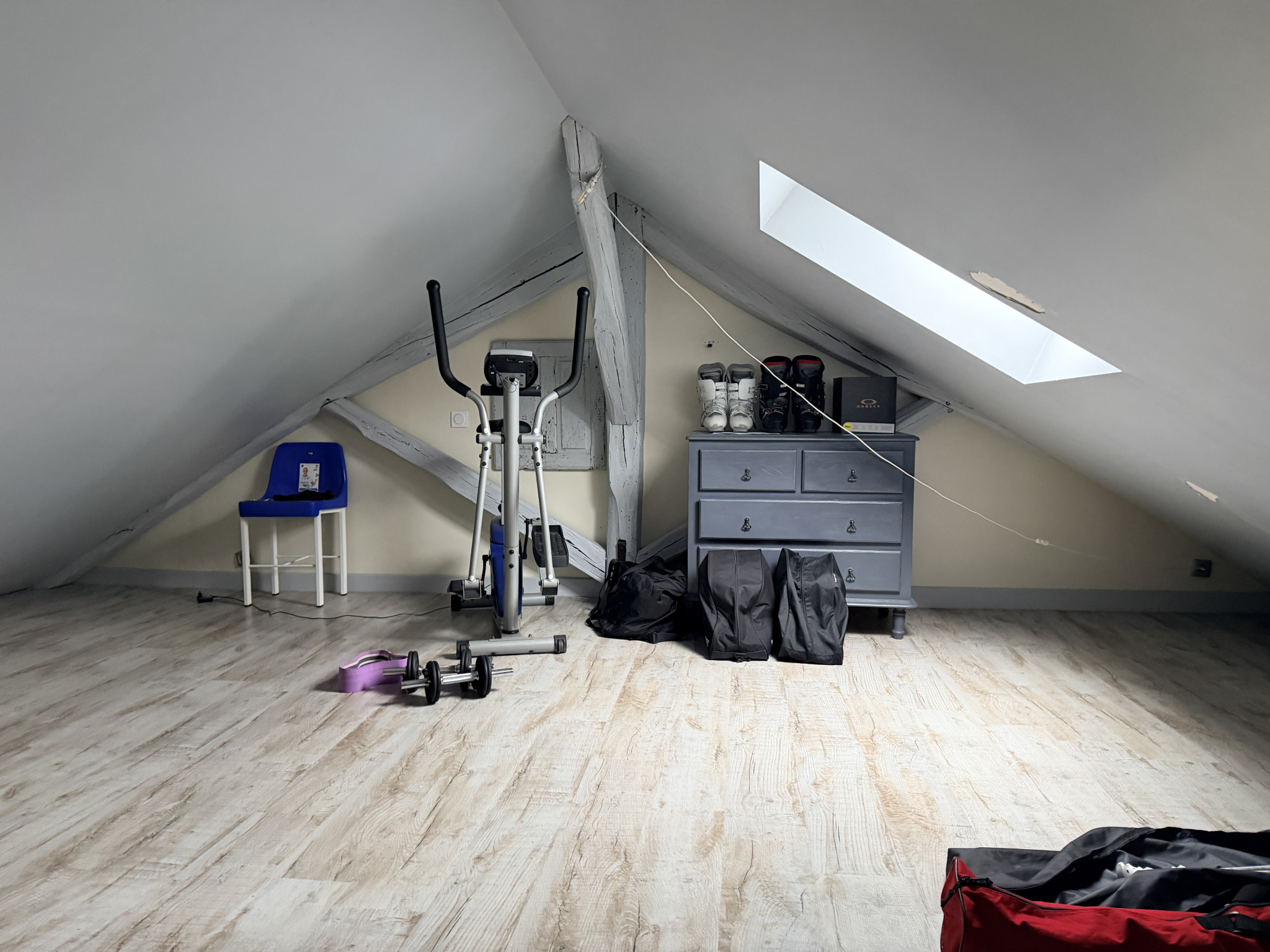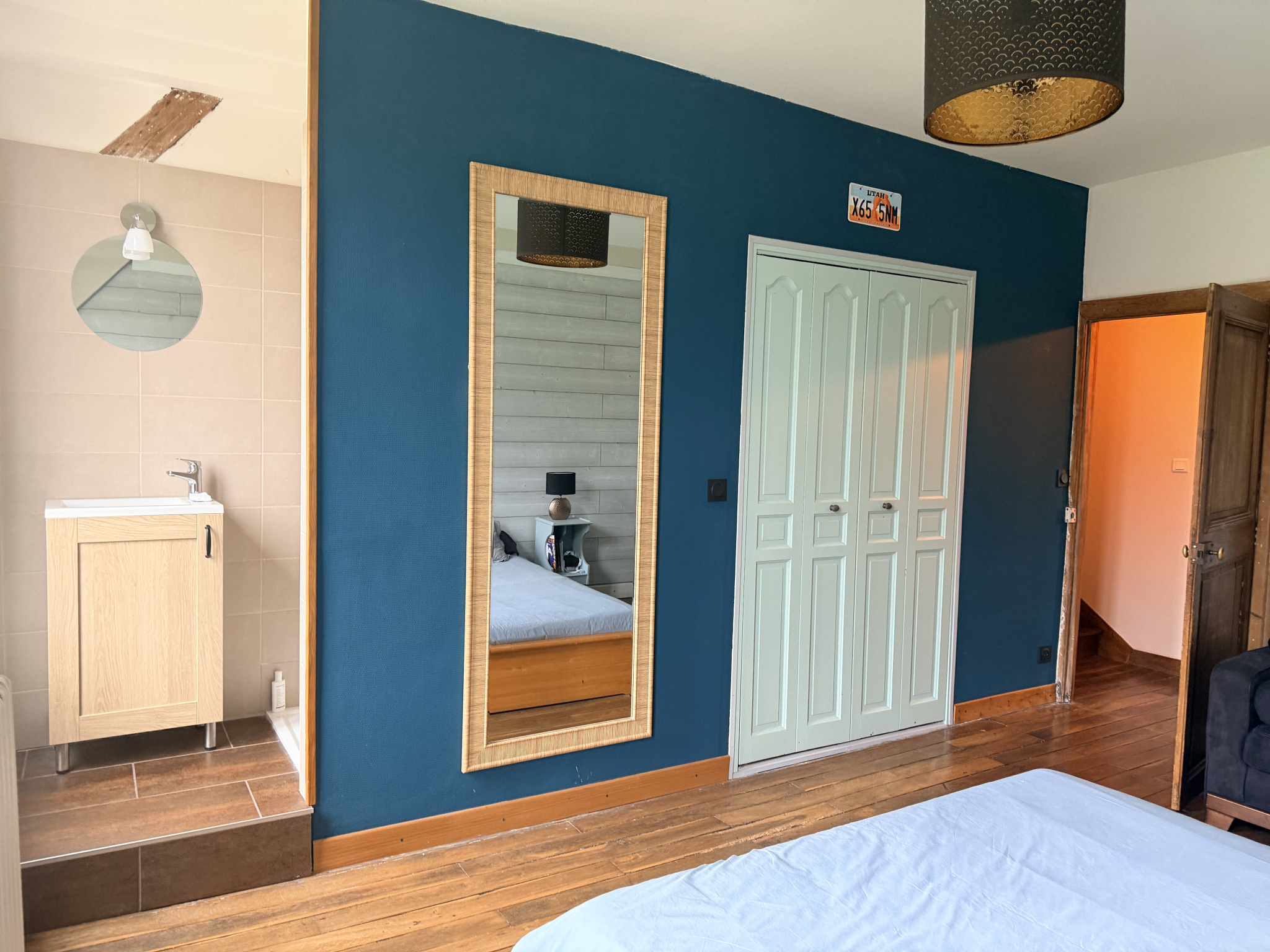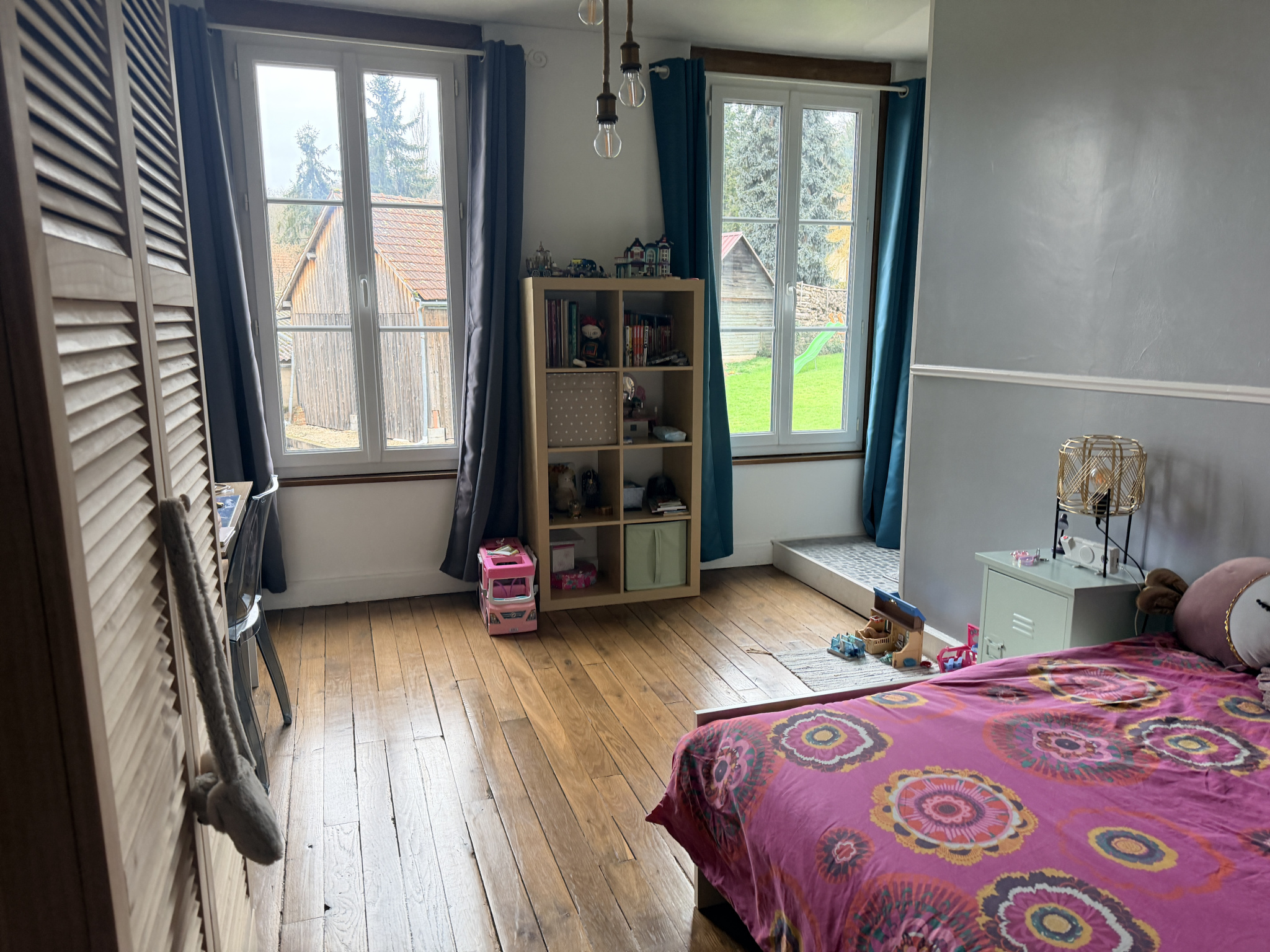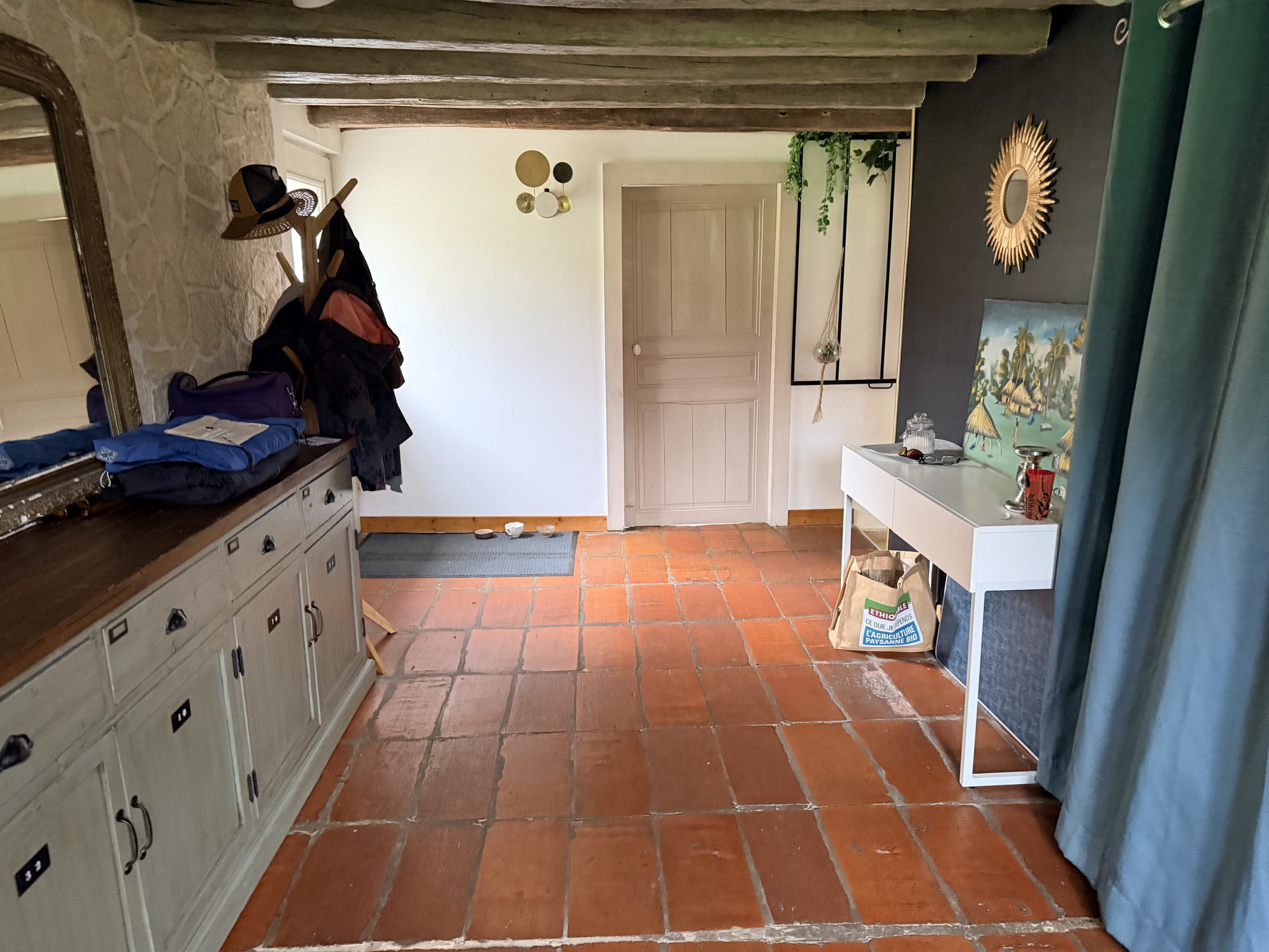 A l'étage: avec deux accès indépendant, un grand palier, salle d'eau, Wc, 4 chambres dont 2 avec salle d'eau privative et une grande chambre avec un espace grenier manssardé (en salle de sport ).