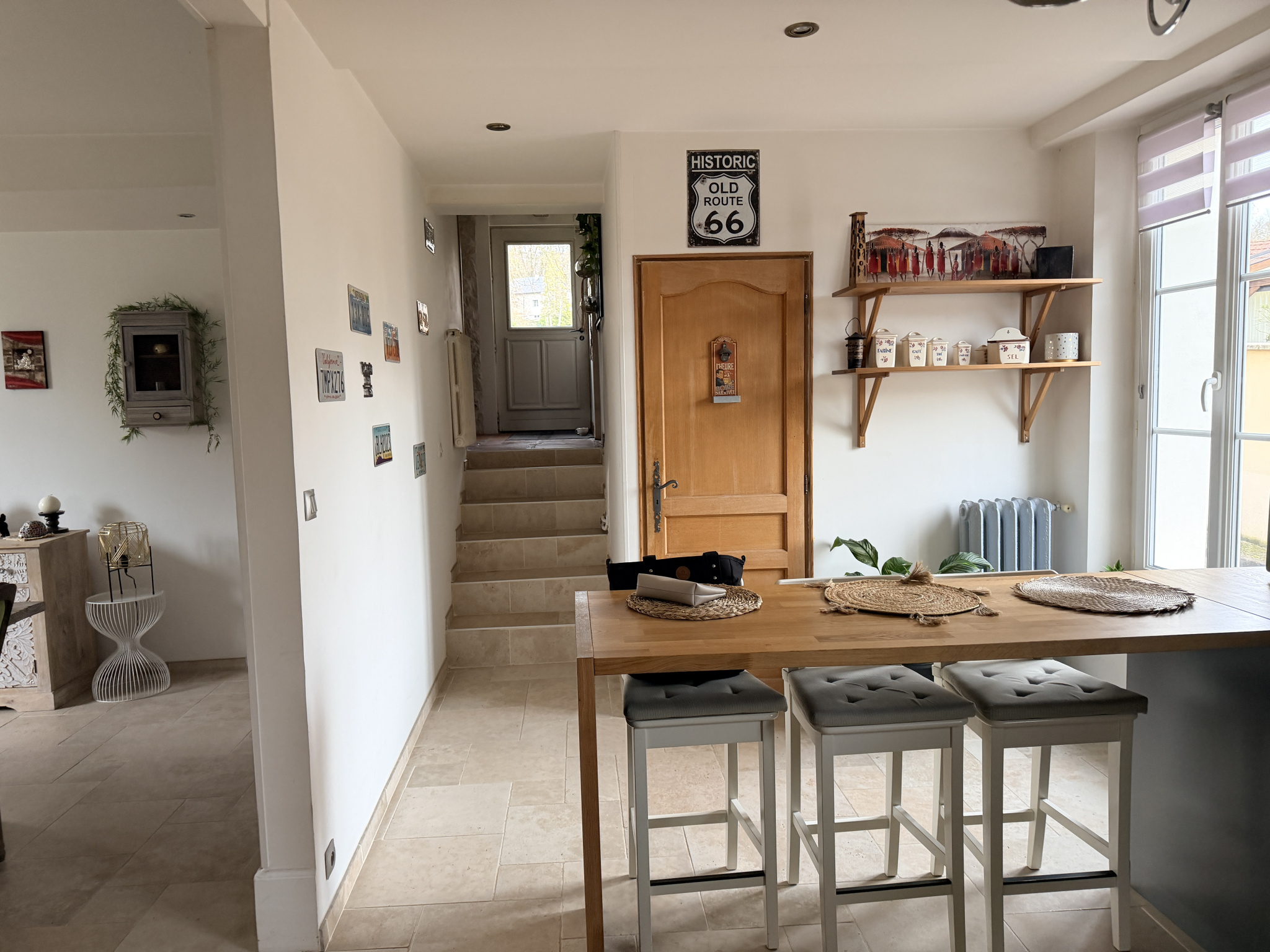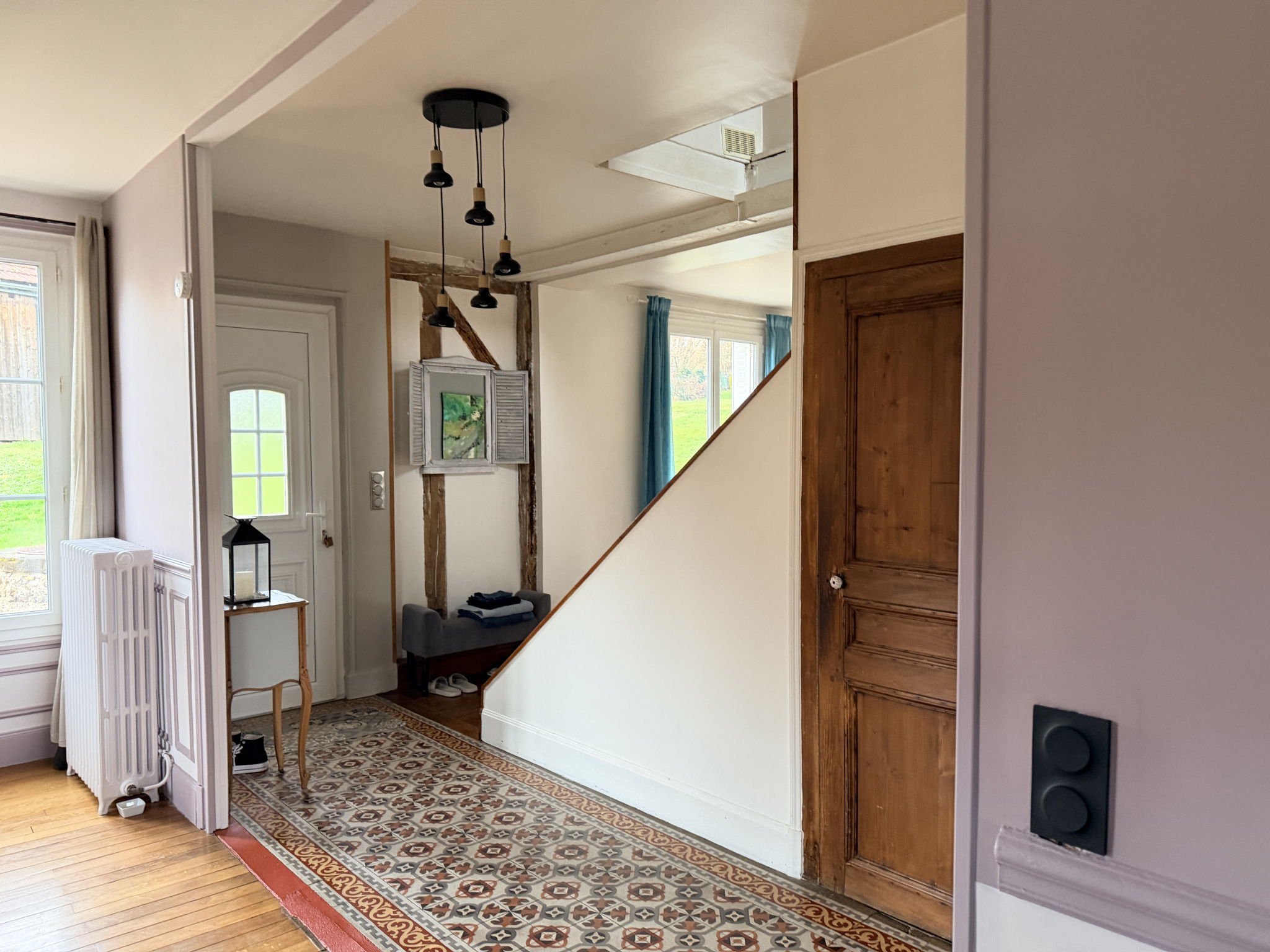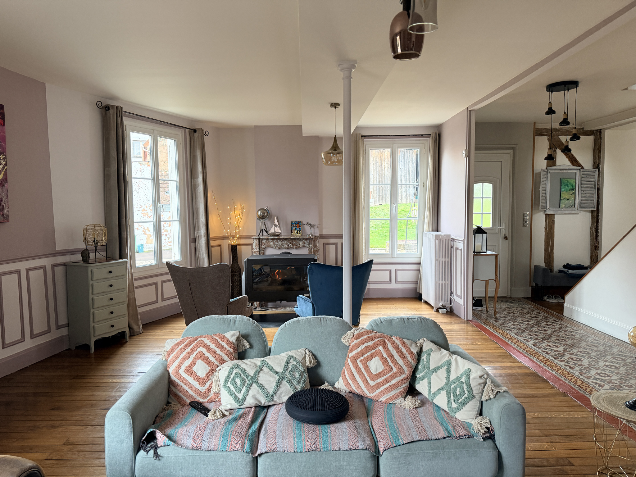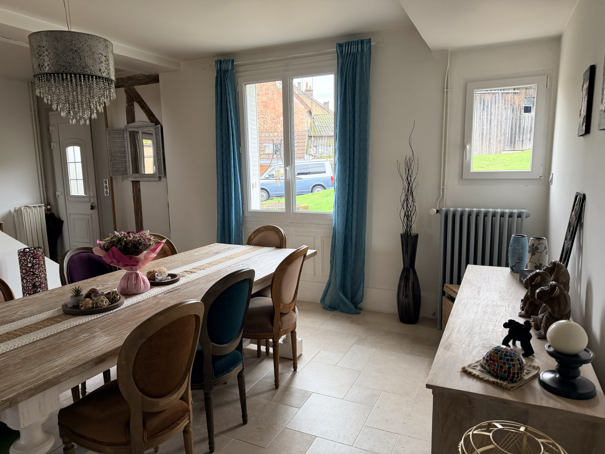 TOUCY, Belle Maison ancienne rénovée avec le charme des poutres, parquet bois, carreaux de ciment, très facile à vivre et lumineuse sur 238 m2 habitables comprenant :Au Rez de chaussée : Une entrée desservant un salon avec poêle à bois et cheminée, une salle à manger ouverte sur la cuisine aménagée et équipée, cellier,
