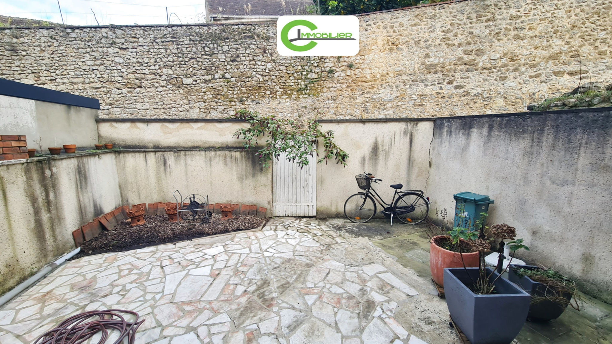 A l'arrière de la maison, une cour close de murs et pavée avec une terrasse disposant d'un accès direct à la ruelle.