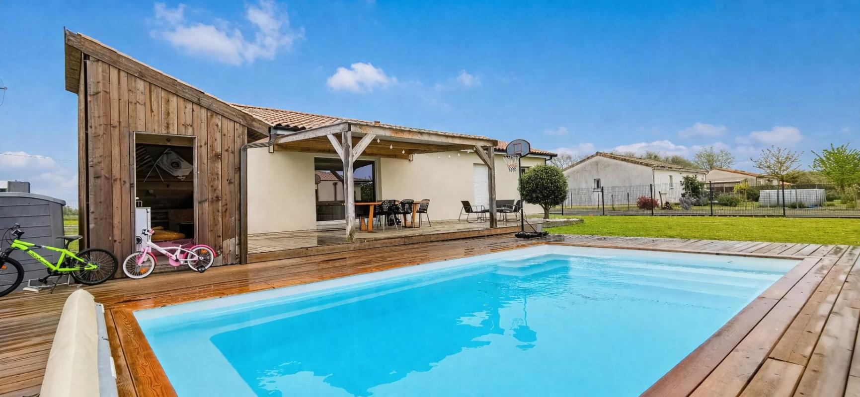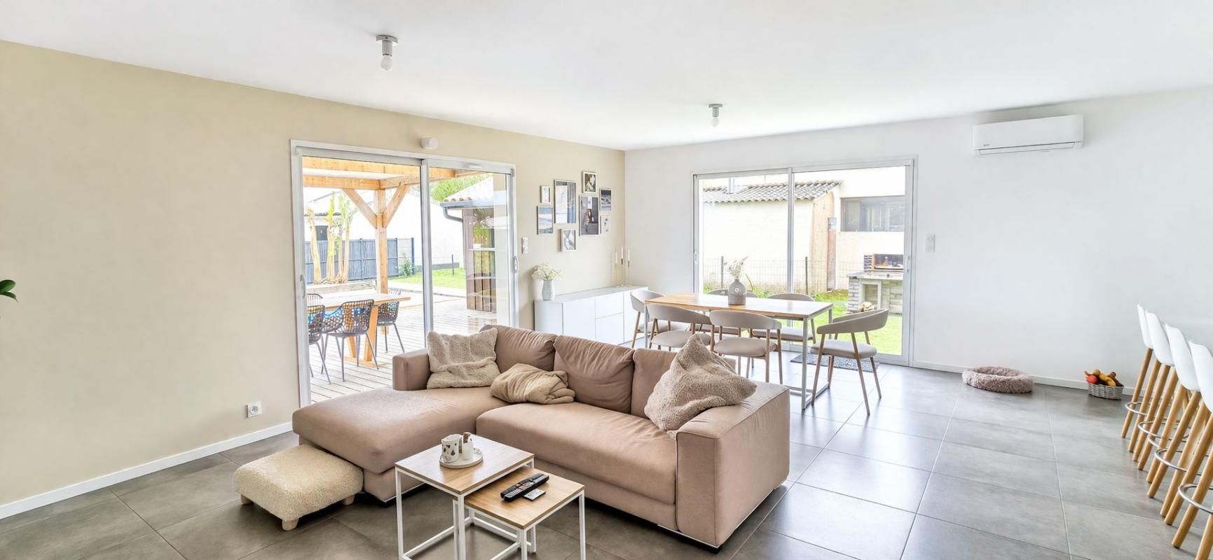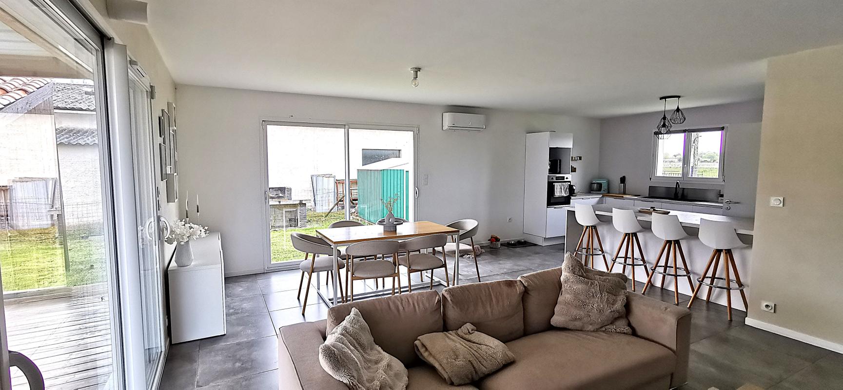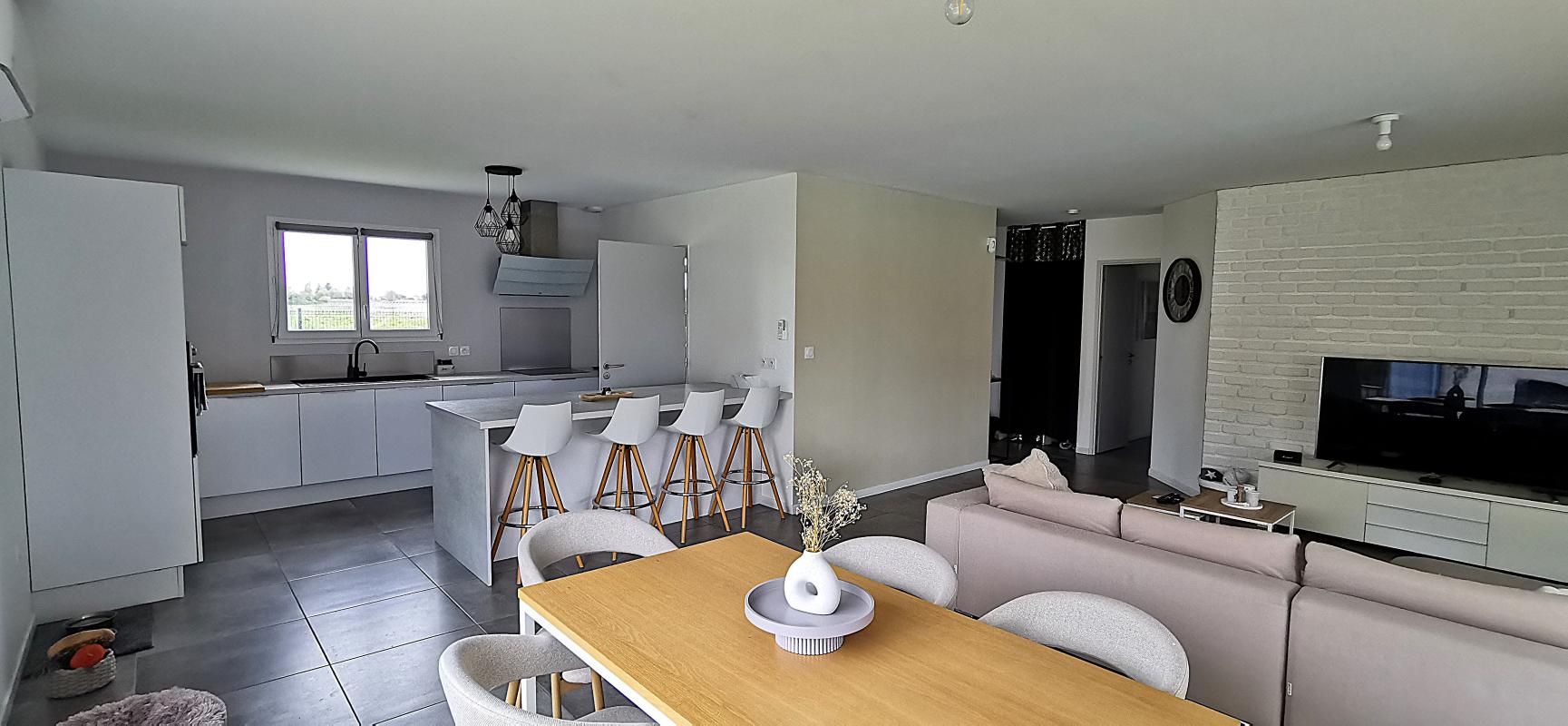 Maison individuelle de plain-pied, construite en 2019 encore sous décennale, d'une surface de 108 m², idéalement située à Bayon-sur-Gironde, proche d'une école et des transports en commun . En excellent état, elle offre un hall d'entrée avec placard, une cuisine entièrement équipée ouverte sur un salon lumineux, un cellier avec buanderie pratique. L'espace nuit comprend 3 chambres – dont 1 chambre avec dressing et 2 chambres avec placards – ainsi qu'une salle de bains contemporaine avec douche à l'italienne et baignoire . Confort optimal : chauffage au sol par pompe à chaleur, climatisation, cumulus thermodynamique, volets roulants motorisés et centralisés .À l'extérieur, terrain clos de 835 m² avec terrasse couverte donnant sur une piscine avec cuisine/bar d'été et parking extérieur - parfait pour recevoir et profiter des beaux jours . Branchements tout-à-l'égout et DPE classé A garantissent performance énergétique et tranquillité d'esprit . Opportunité rare à visiter rapidement - contactez-nous pour organiser une visite !
