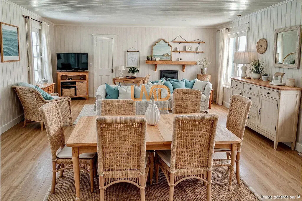 Le séjour, agrémenté d'une cheminée, apporte chaleur et caractère à la maison.