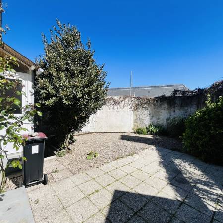 Au rez de chaussée : une entrée, un wc, une grand séjour lumineux avec cuisine ouverte et accès à la cour, une chambre, et une salle de bain avec wc.