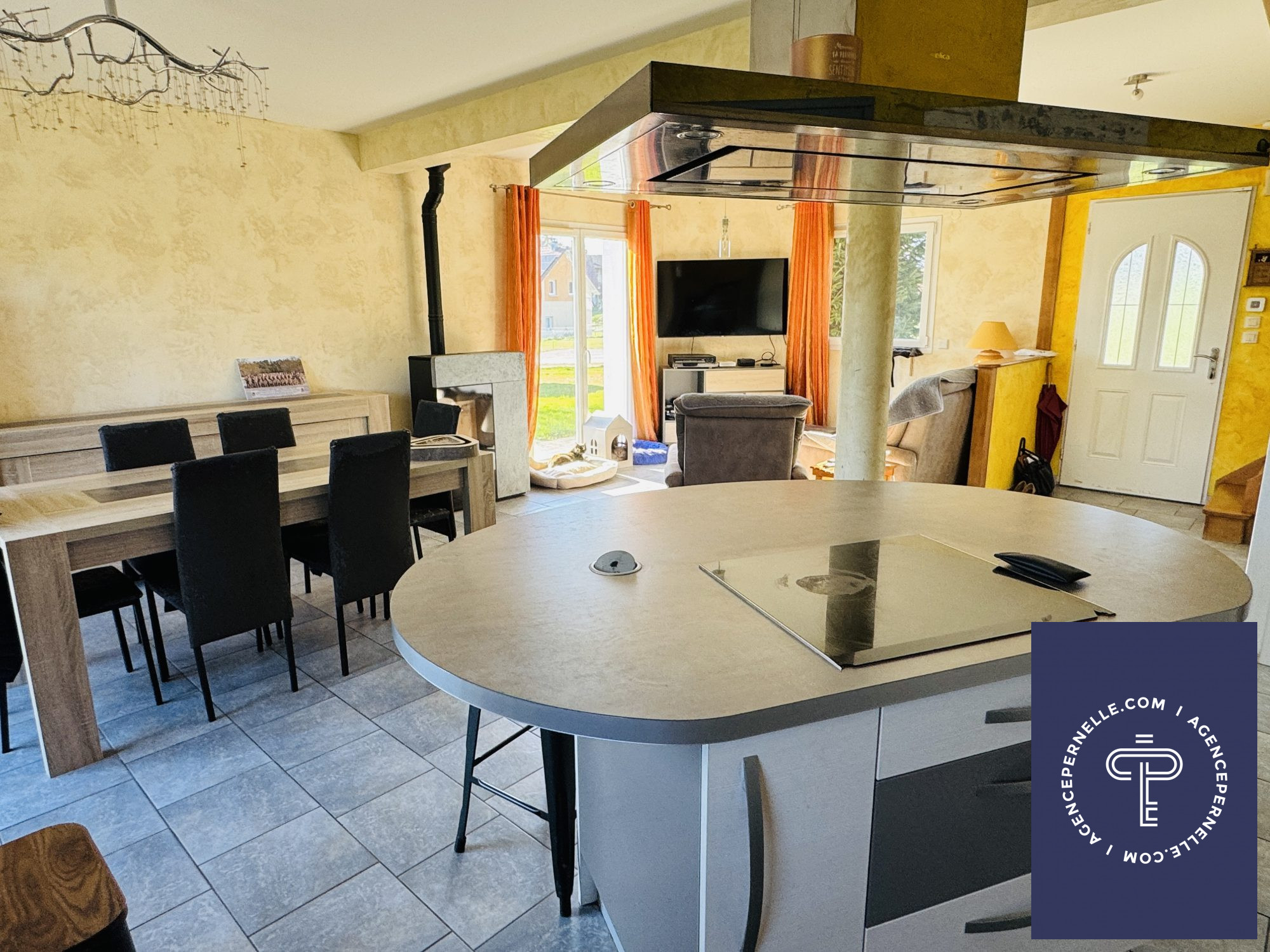 Au rez-de-chaussée une vaste pièce de vie lumineuse, avec une cuisine entièrement équipée ouverte sur un salon-séjour agrémenté d'un poêle à granulés.