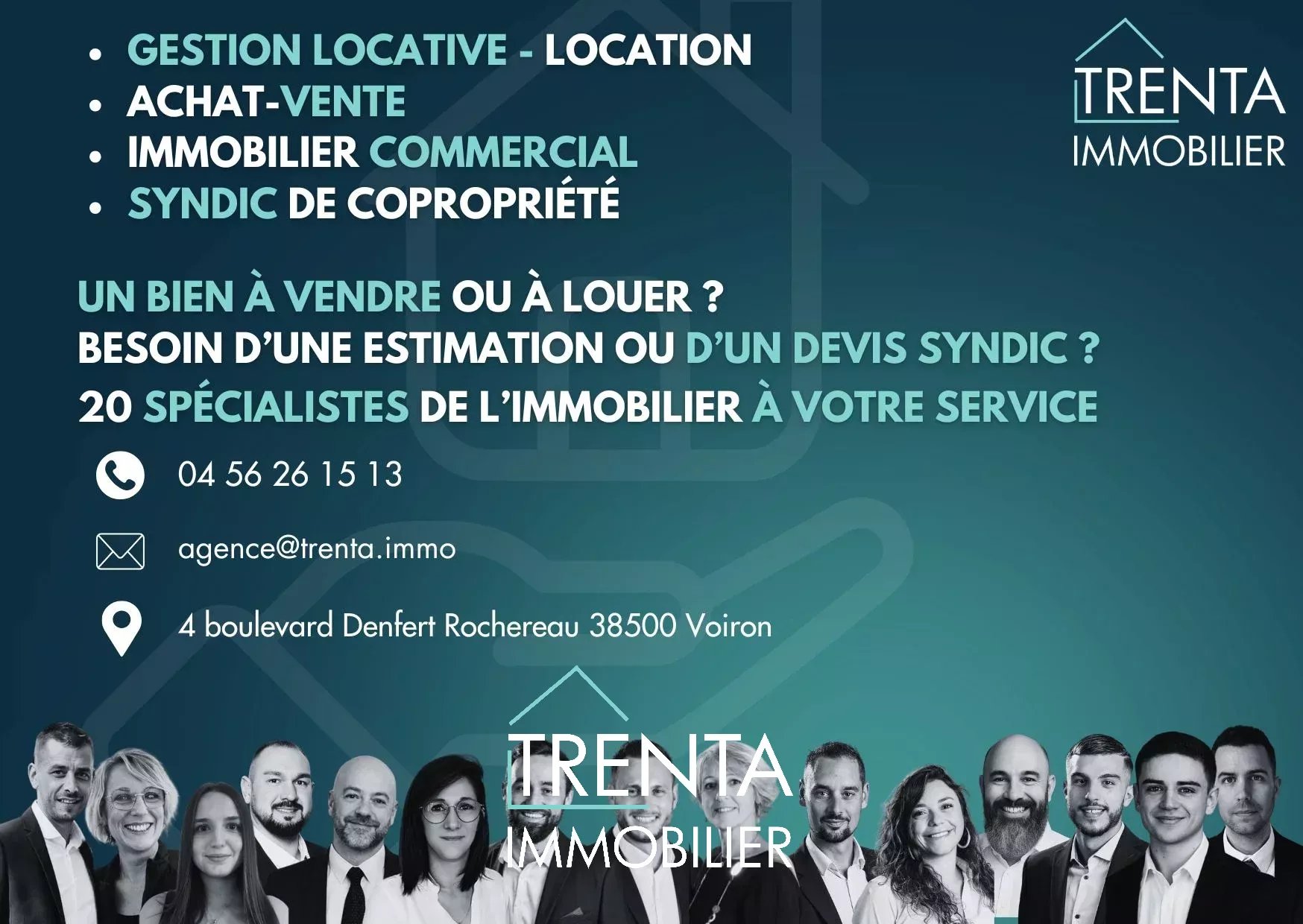TRENTA IMMOBILIER – SARL au capital de 5 000 euros – Siège social : 4 Boulevard Denfert Rochereau, 38500 Voiron – RCS Grenoble n° 843 242 017 – Carte professionnelle n° CPI 3837 284 délivrée par la CCI de Grenoble – Garantie financière : 110 000 euros SO.CA.F – Ne reçoit aucun fonds – Tél.