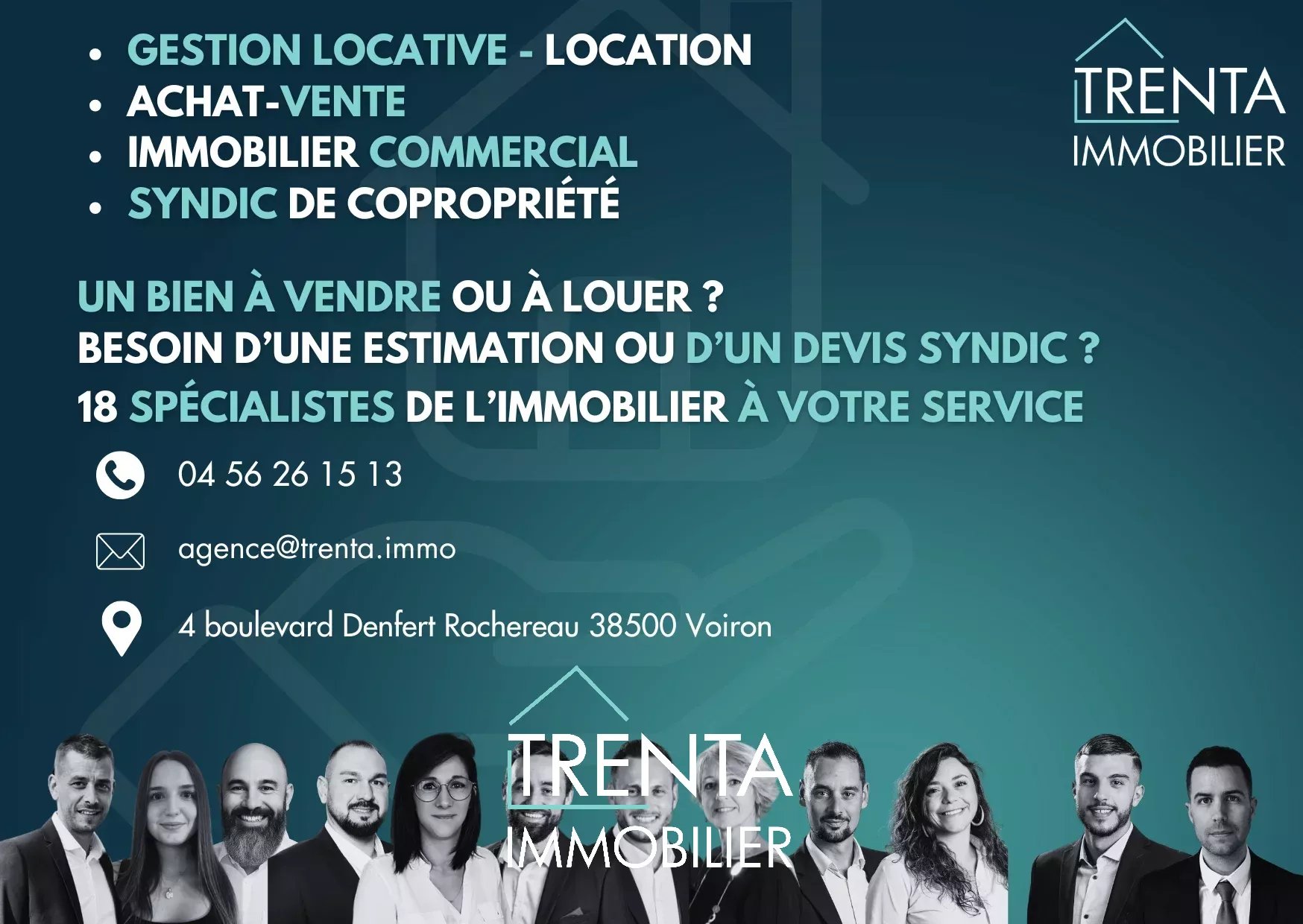 TRENTA IMMOBILIER – SARL au capital de 5 000 euros – Siège social : 4 Boulevard Denfert Rochereau, 38500 Voiron – RCS Grenoble n° 843 242 017 – Carte professionnelle n° CPI 3837 284 délivrée par la CCI de Grenoble – Garantie financière : 110 000 euros SO.CA.F – Ne reçoit aucun fonds – Tél.