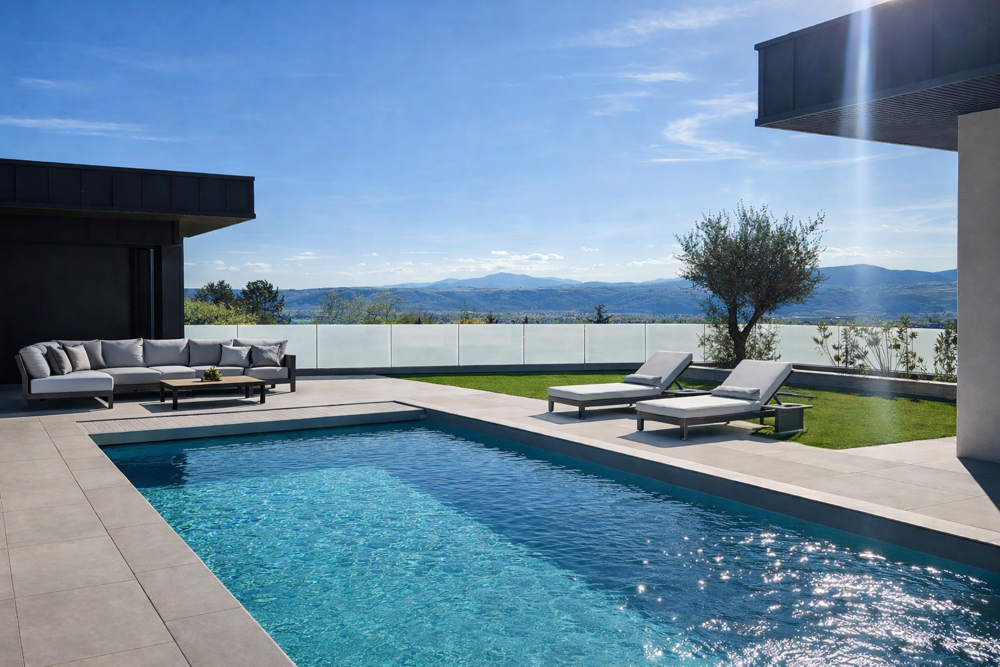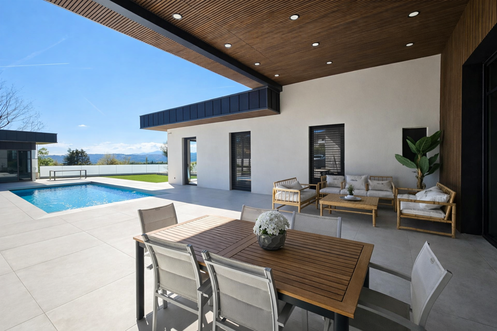 Une pièce à vivre de 100m2 sublimée par une belle hauteur de plafond, de grandes baies vitrées faisant apparaitre une vue panoramique à couper le souffle sur la piscine et sur le Pilat comme un tableau grandeur nature se modifiant suivant la saison et le temps, s'ouvrant sur une spacieuse terrasse de plus de 100m2 où vous pourrez apprécier la vue et la piscine chauffée.