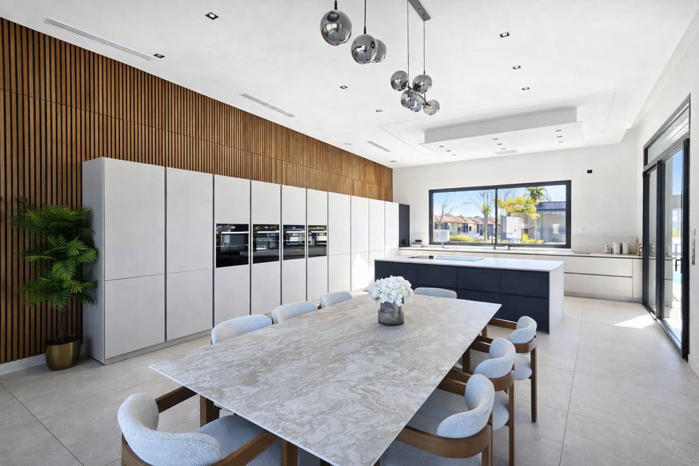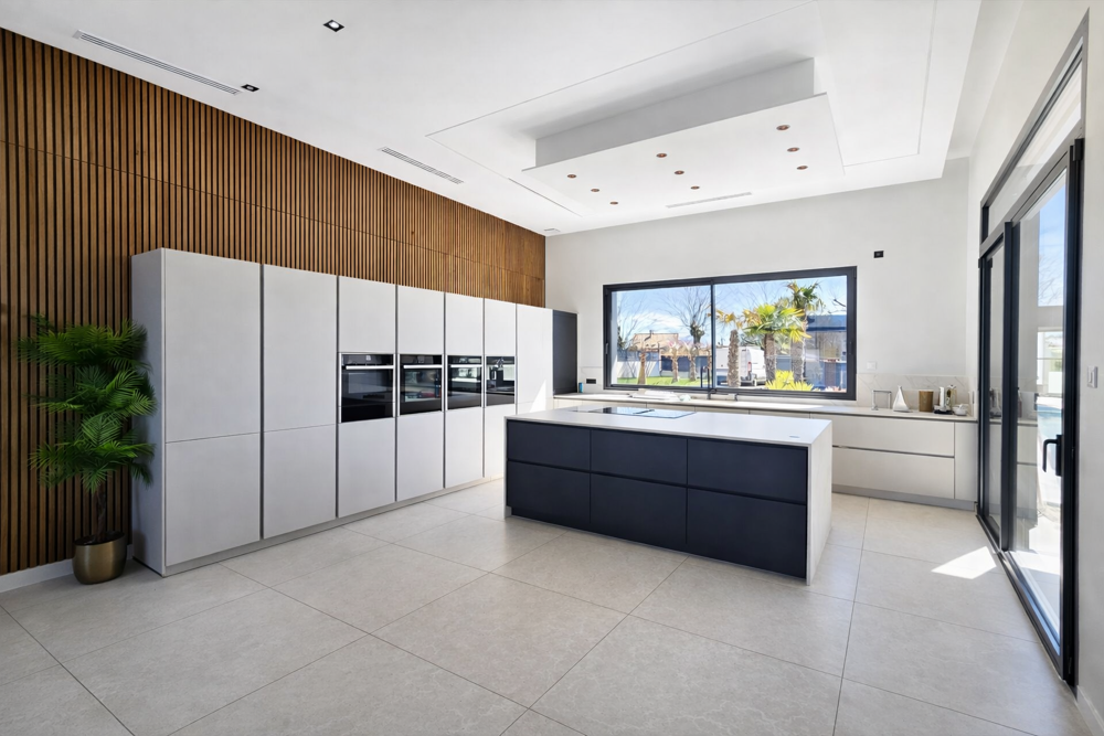 Cuisine américaine entièrement équipée haut de gamme avec une alliance de bois et de modernité lui apportant toute son élégance.