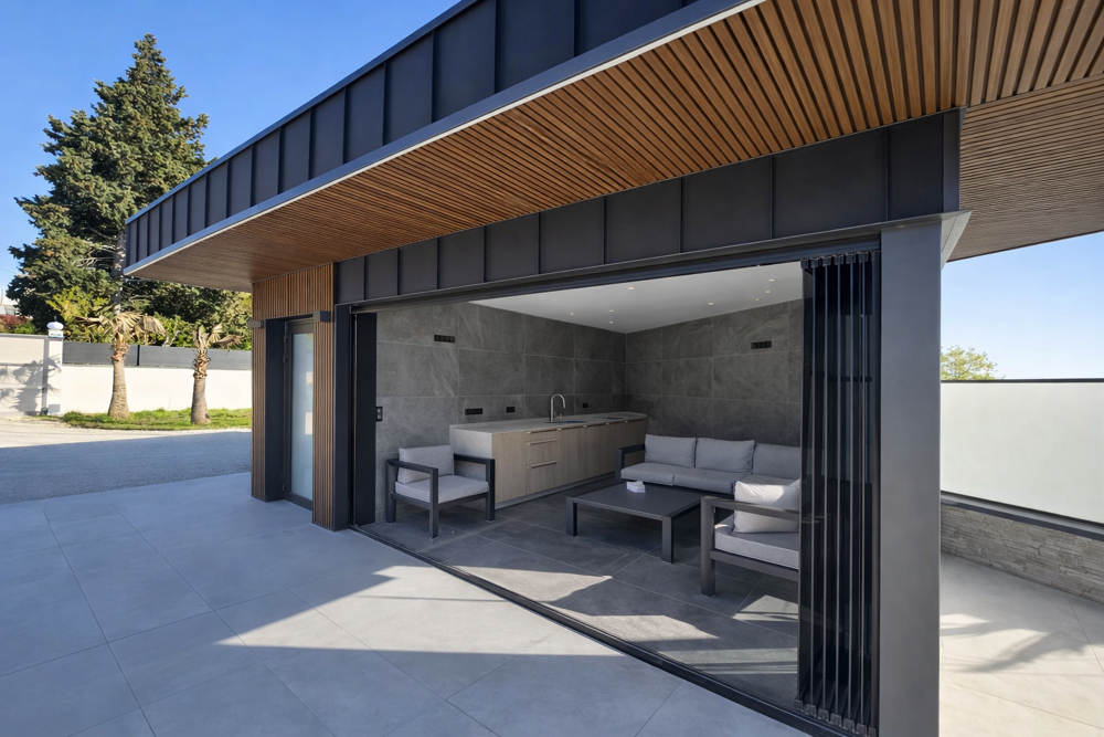 Les extérieurs somptueusement aménagés avec une végétation arrosée automatiquement, mis en valeur par un éclairage indirecte, système de led en lumière indirecte sur la maison et pool house, à l'intérieur également. Palmiers, Oliviers et diverses plantes exotiques ajoutent une ambiance du sud à l'harmonie du site, on ne pouvait rêver d'un plus gracieux écrin pour un si beau bijoux.