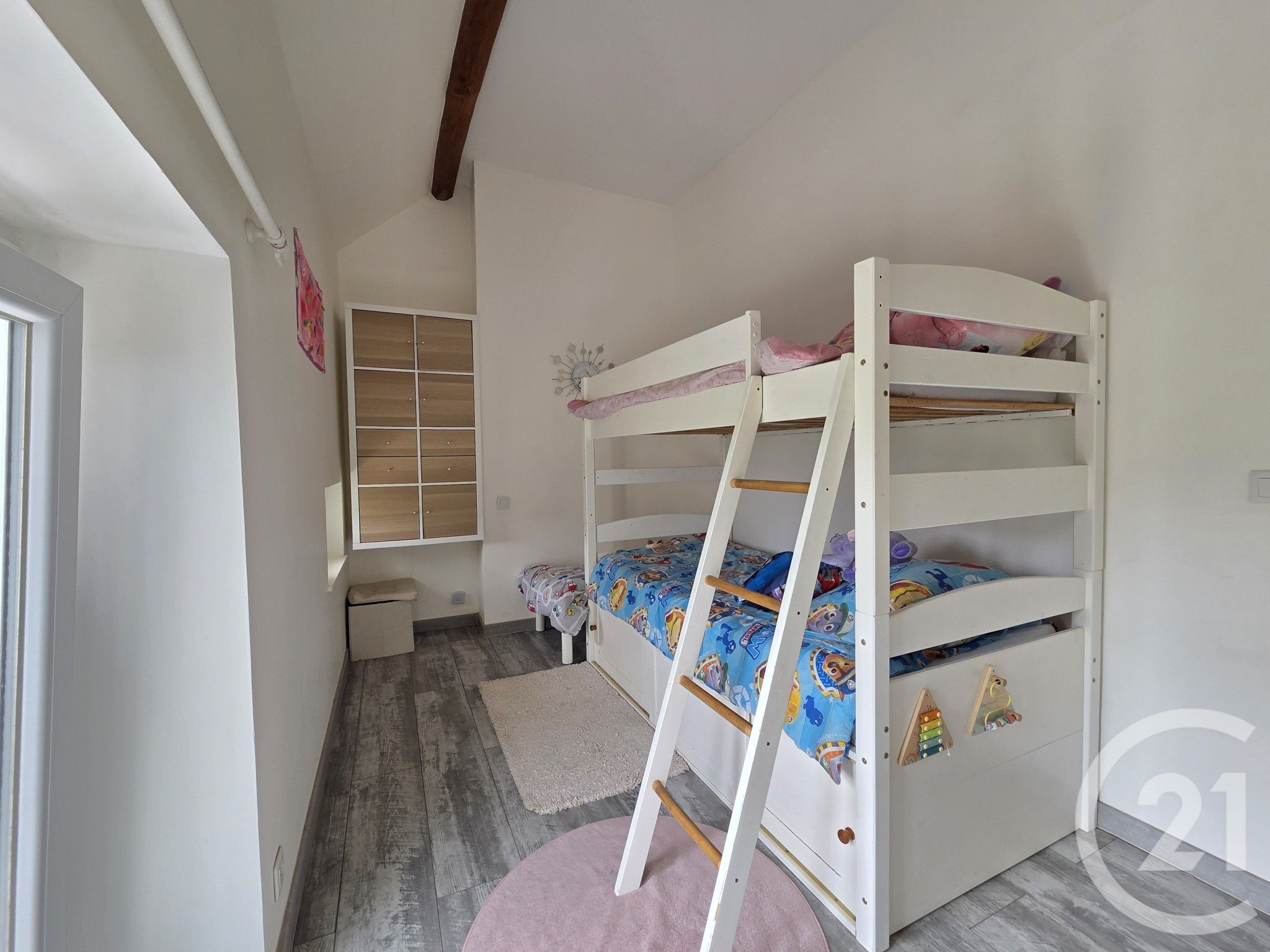 A l'étage, un palierbureau ouvre la porte à un petit espace de travail ou de jeux, deux chambres ainsi qu'une salle d'eau et WC indépendant.