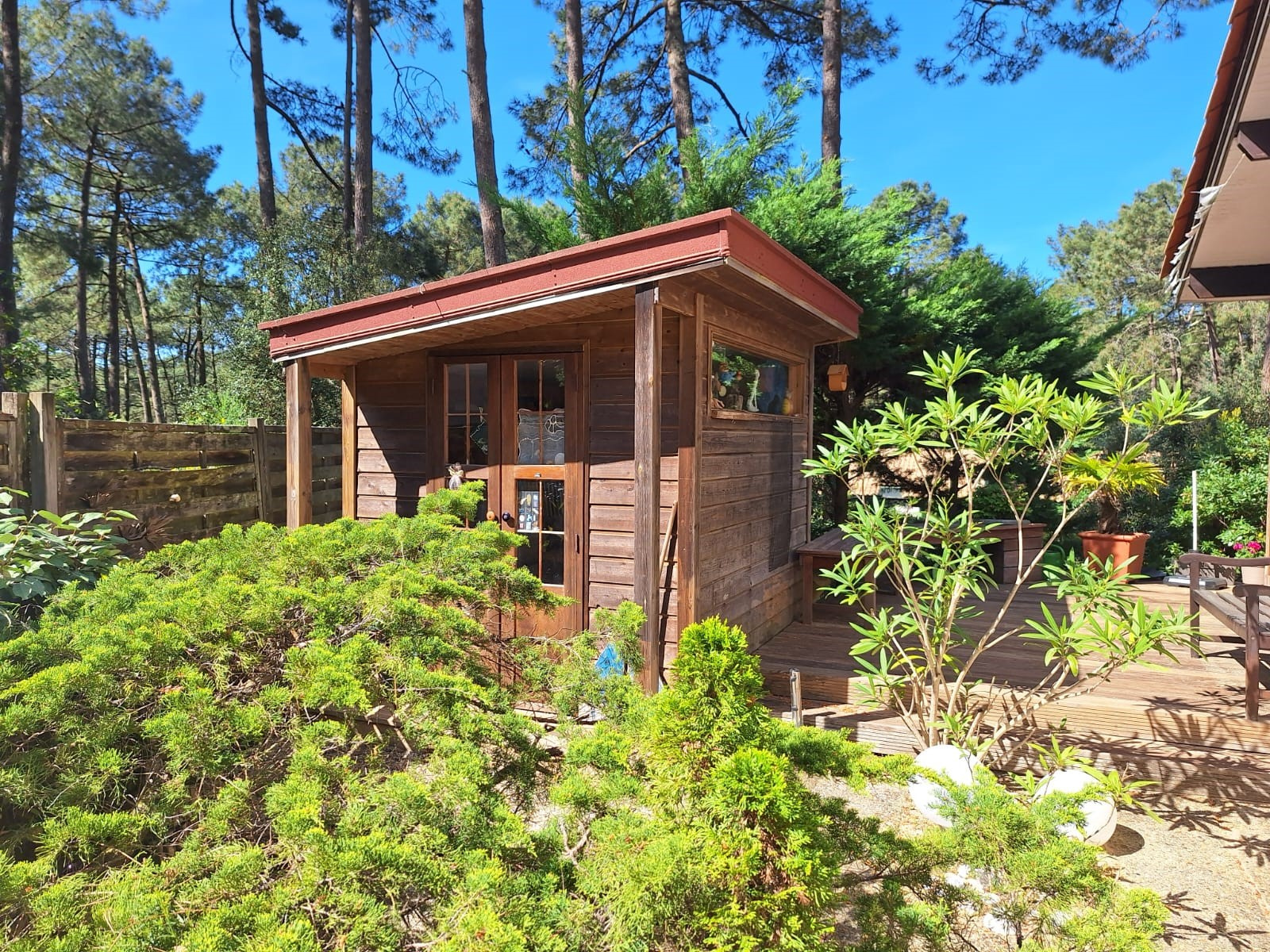 Un cellier attenant de 3 m2 ainsi qu'un abri de jardin de 5 m2 permettent de stocker facilement mobilier d'extérieur, vélos ou matériel de sport.