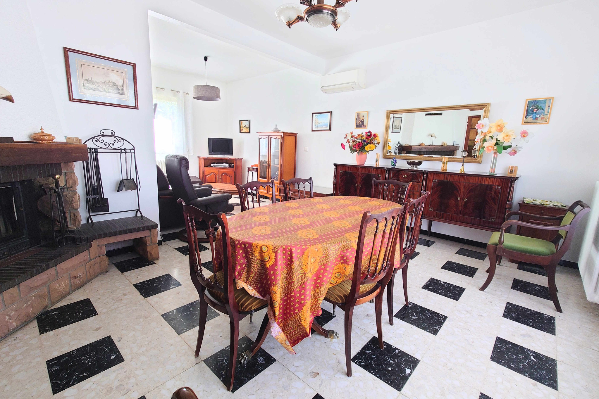 Le Chauffage est assuré par une Climatisation réversible, par une Chaudière au Gaz de Ville avec des radiateurs en fonte et par une Cheminée avec insert. La Climatisation équipe les Chambres et le Salon Salle à manger.