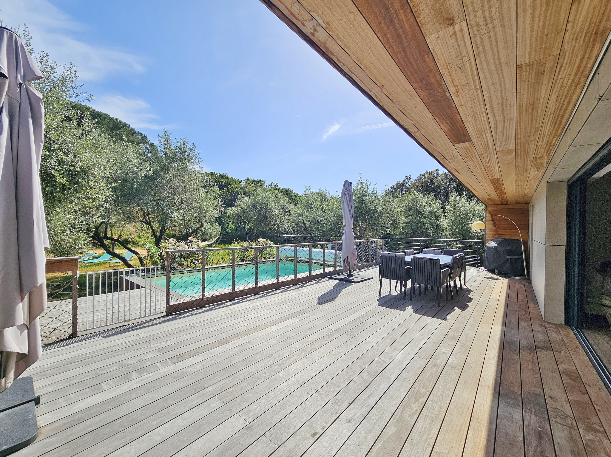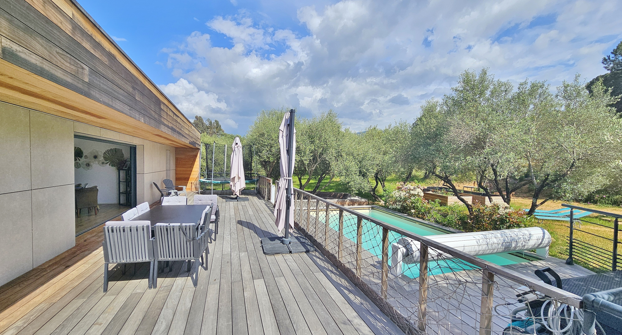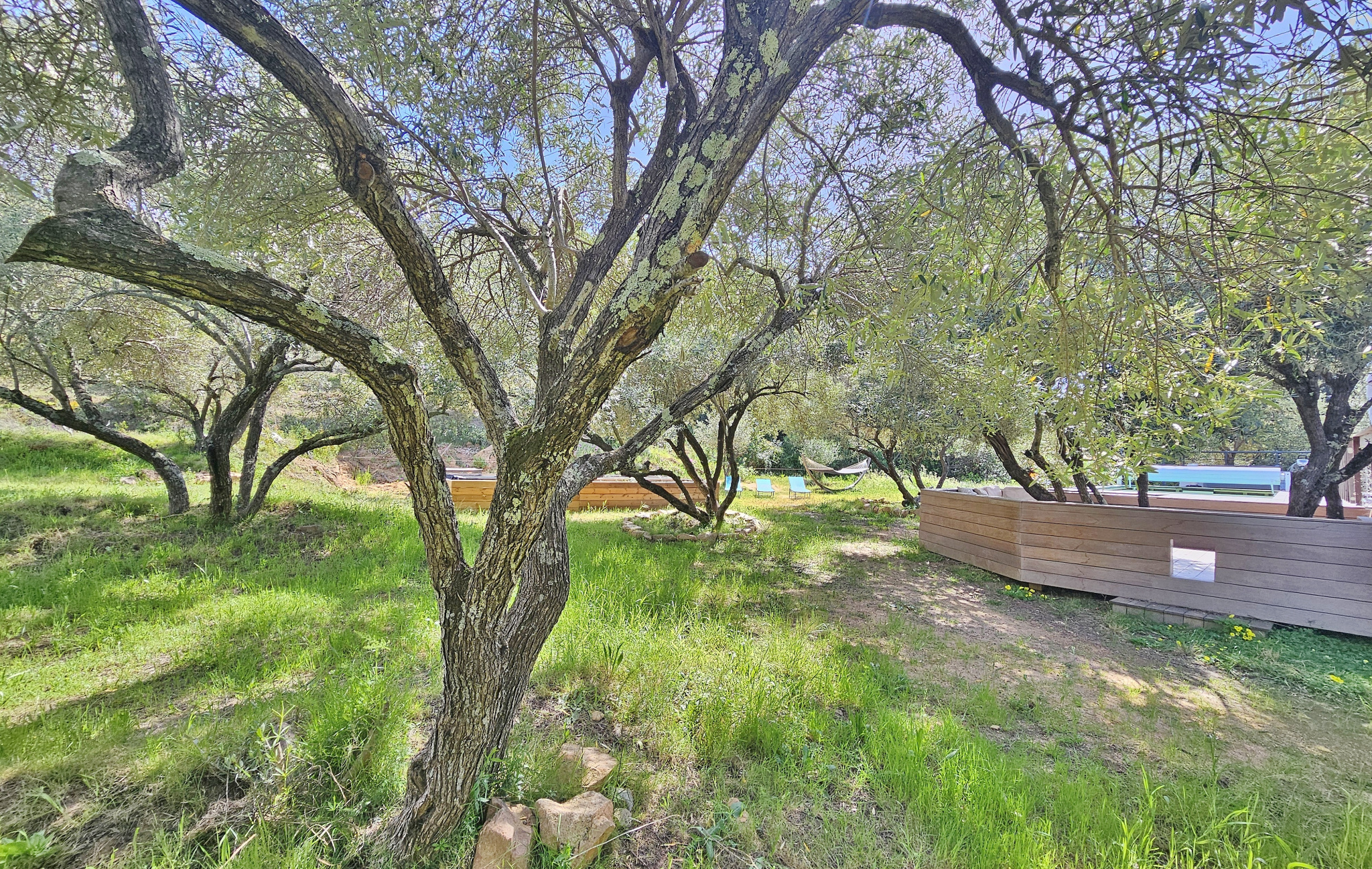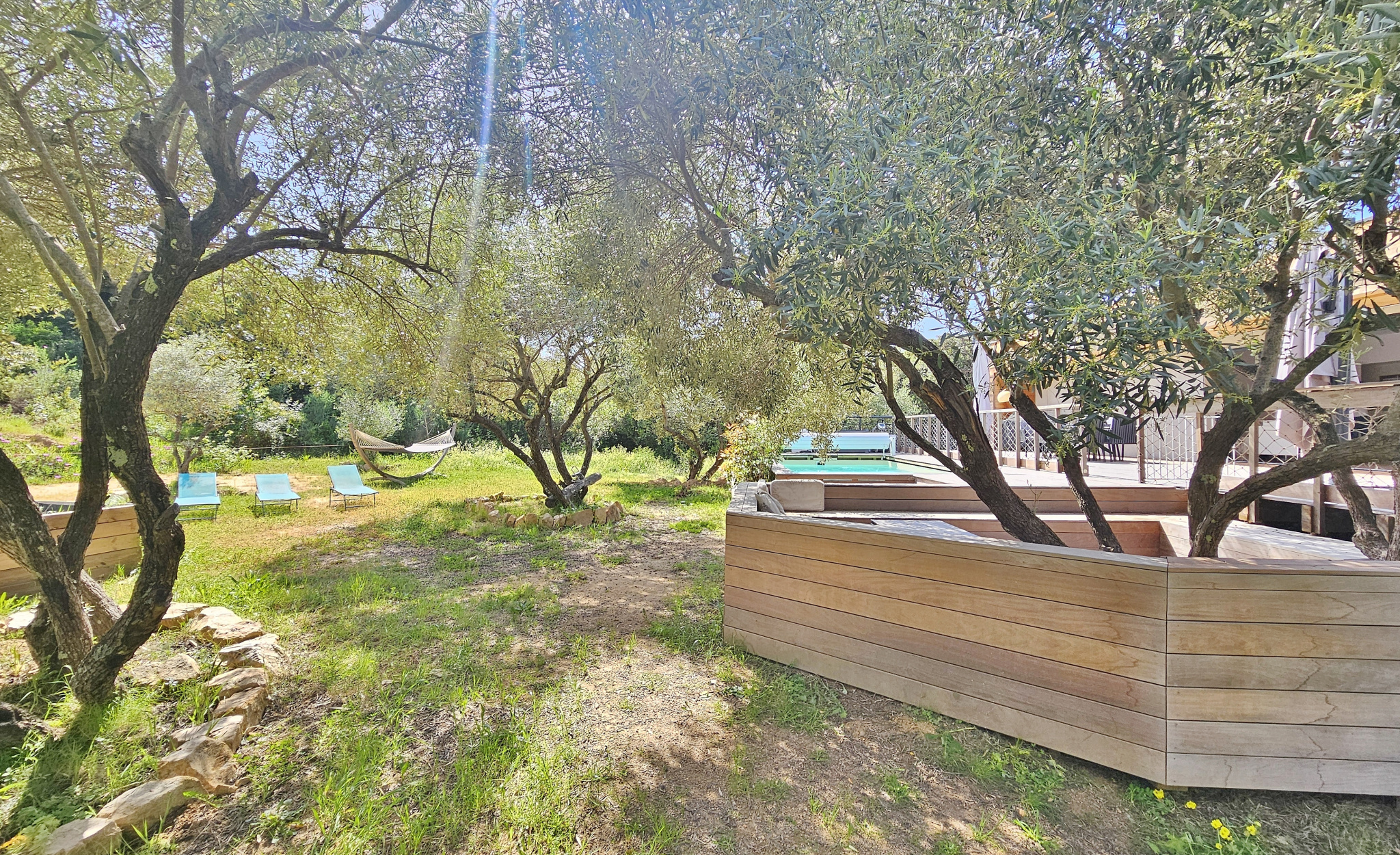 Agréable environnement extérieur paysagé avec spacieuse terrasse, piscine, salon ombragé, jardin joliment arboré d'oliviers et espace potager.
