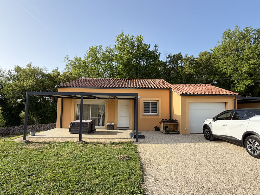 Située dans un environnement calme et préservé, à 20 minutes de Cahors et 15 minutes de Prayssac, cette maison de plain-pied construite en 2022 offre confort et modernité.Elle se compose d'un salon-séjour traversant et lumineux, de deux chambres et d'une salle d'eau. Deux terrasses avec vue, une dépendance de 12 m2 et un système de récupération d'eau complètent l'ensemble.