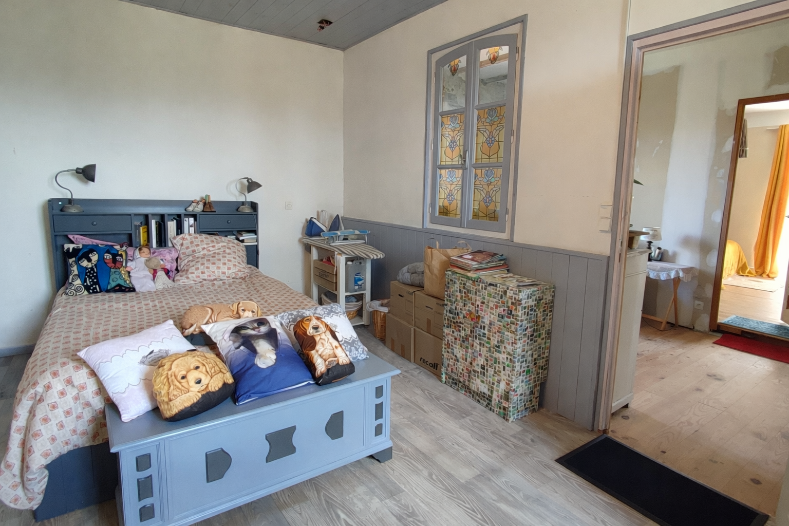 À l'étage, un vaste palier en parquet fait office de coin lecture et petit salon. Un espace est également prévu pour un bureau. Une première chambre, chaleureuse et entièrement terminée, dispose d'un superbe dressing et d'un accès à une terrasse privée offrant une vue imprenable sur la campagne. Une seconde chambre, bien que non rénovée, est déjà confortable, lumineuse et spacieuse. Aucun travaux ne sont à prévoir pour les chambres.