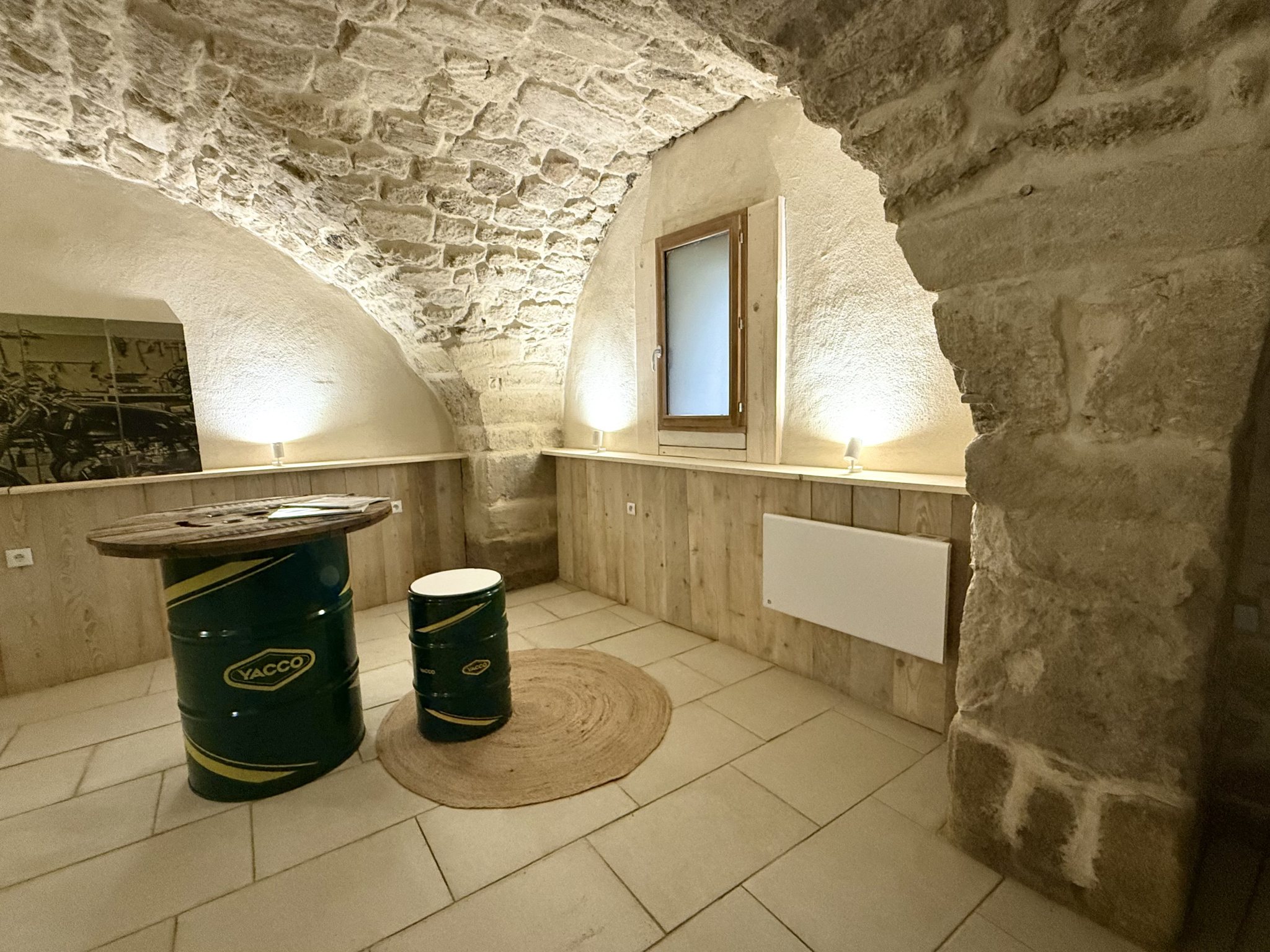 La cave dispose de l'électricité, de la fibre, de toilettes sèches, ainsi que de deux radiateurs à inertie sèche neufs, offrant un espace fonctionnel et sécurisé.