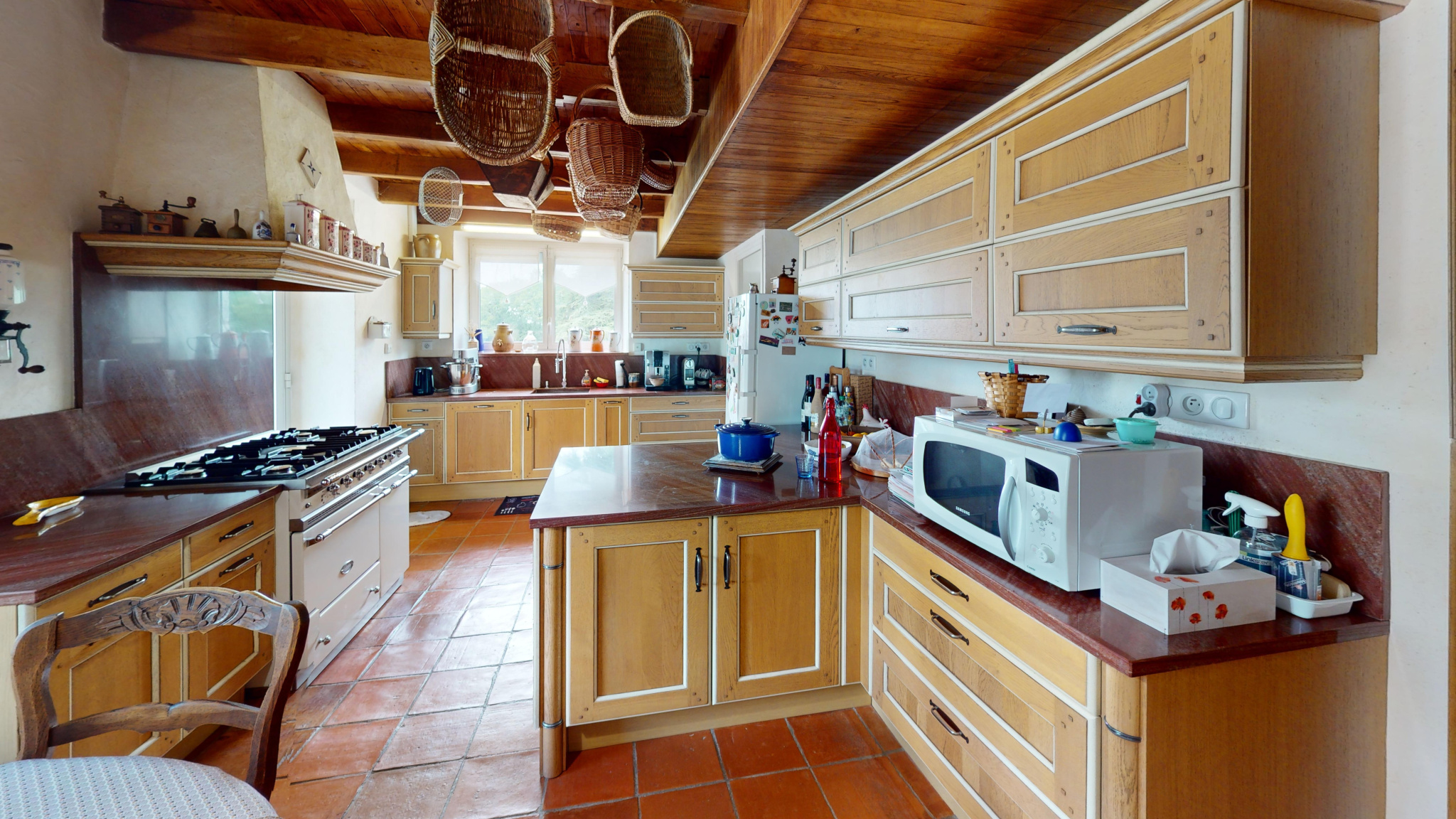 Cuisine équipée de 19 m2 avec cellier de 5 m2, ouvrant sur une terrasse ensoleillée près de la piscine