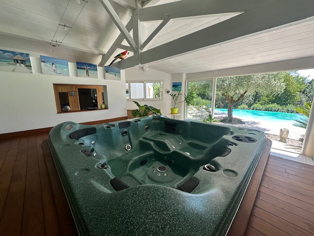 Coté extérieur un espace de détente et bien être: spa, jacuzzi, Hamman, salle de sport, douche et wc pour un confort absolu.