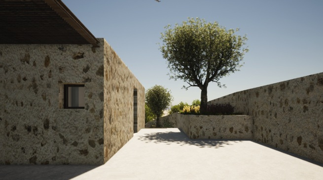 Se voulant être une restanque naturelle, son implantation scinde le terrain en deux : une partie haute (entrée de la maison) et une partie basse (lieu de vie).