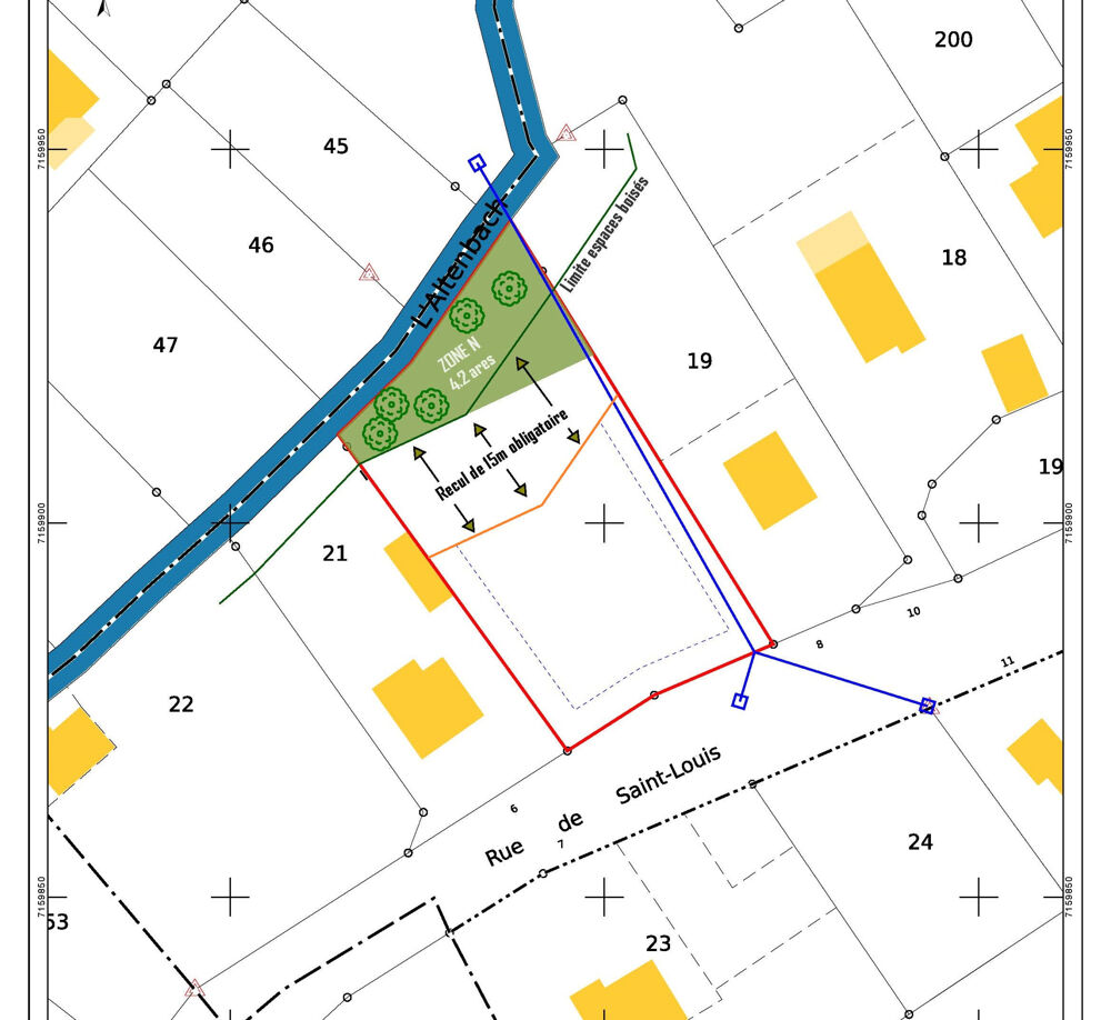 Selon les préconisations du PLU, il est possible de construire une maison individuelle ou bien une maison jumelée car seule la moitié du terrain est constructible, soit environ 10.50 ares (plan annexé).