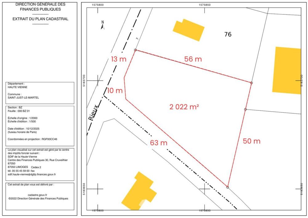 Parcelle de 2 022 m², constructible, située dans un secteur calme à 20 minutes de Limoges-Centre. Terrain non viabilisé, avec :