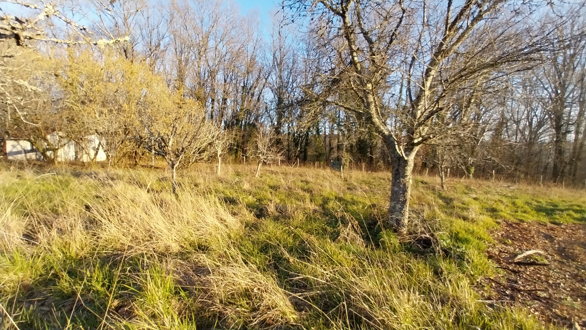 Sur l'avant, un pré constructible avec quelques arbustes accessible par un portail et partiellement clôturé.
