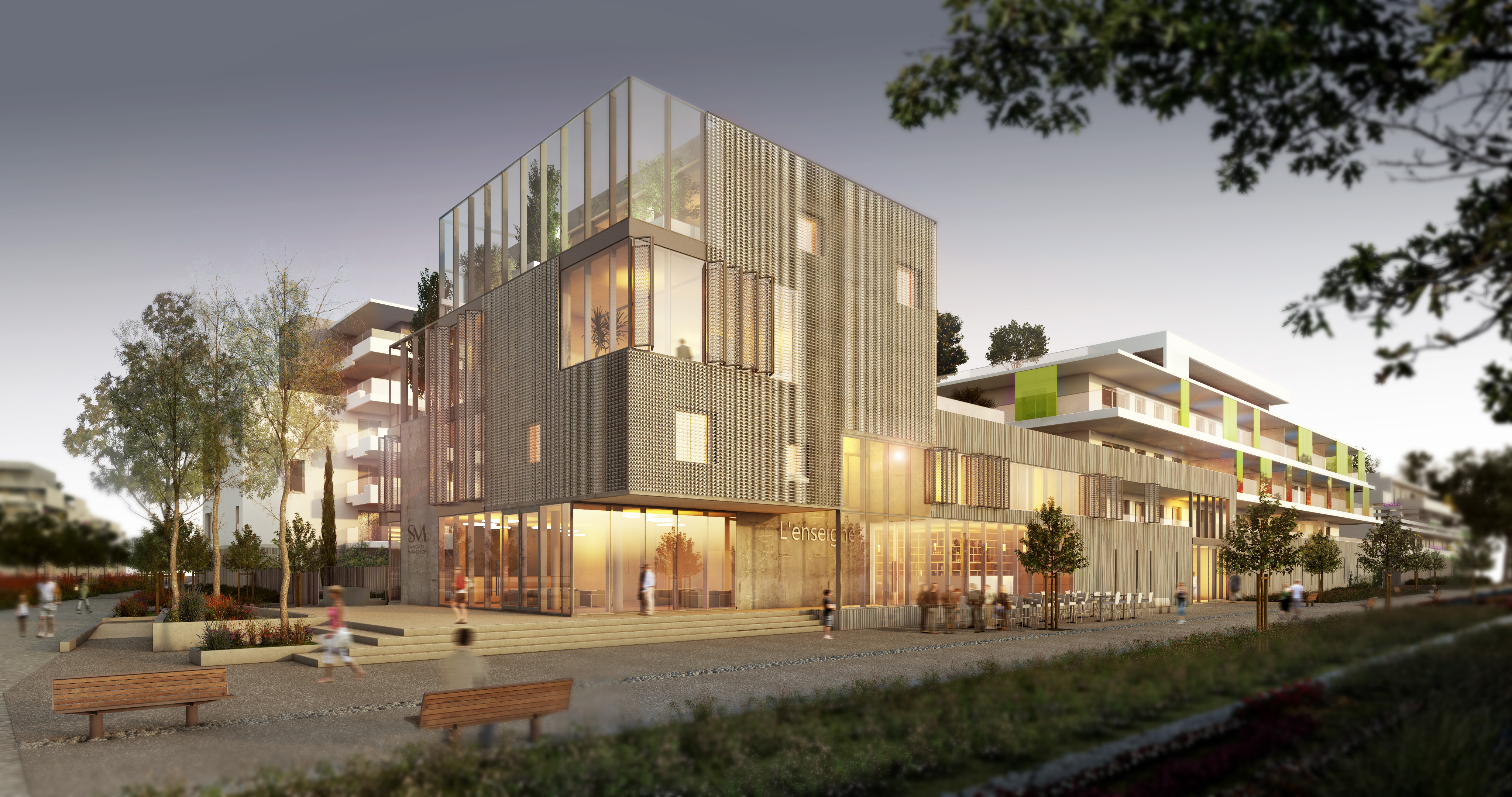 Habillée de son plus bel ensemble, ses panneaux dichroïques ponctuent les façades et les variations de couleurs; telles des aurores boréales apportent une touche de légèreté. Ainsi, les lignes pures et modernes assoient sa discrétion et la rendent élégante jusqu'au coucher de soleil. Puis l'heure passée, elle se tamise dans un EcoQuartier faisant la chasse aux pollutions lumineuses.