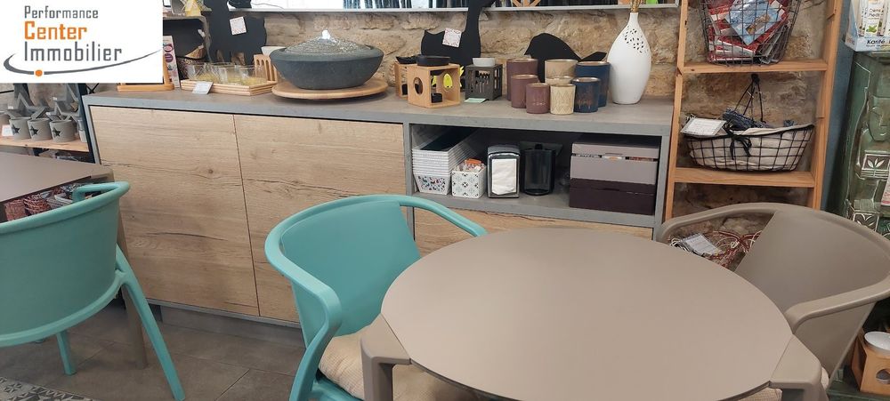 Il comprend une grande salle showroom avec mur en pierre de taille, Une cuisine ouverte équipée, 2 réserves,