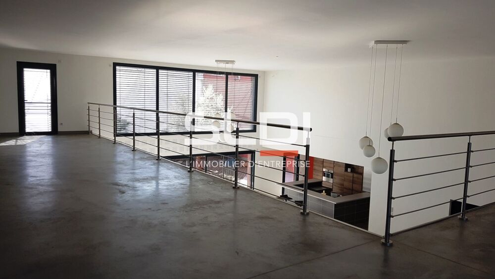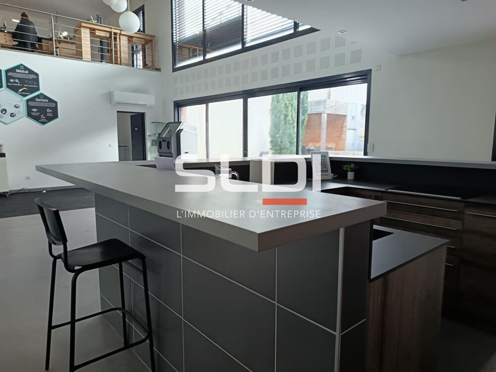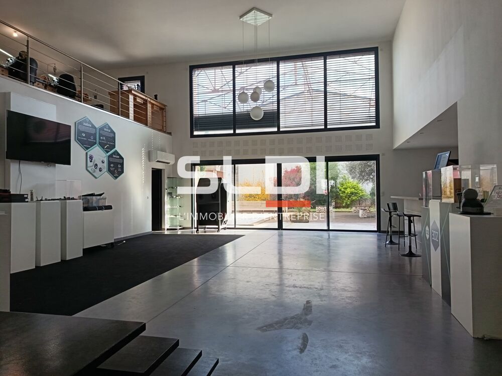Ce bâtiment très atypique, offre un cadre de travail privilégié ultra confortable pour l'ensemble des collaborateurs, car il est doté d'un jardin privé avec une piscine. Cet ensemble est composé de 2 espaces bien distincts : activités - entrepôt de 600 m² et bureaux en RDC et mezzanine avec espace détente et cuisine aménagée de type US.